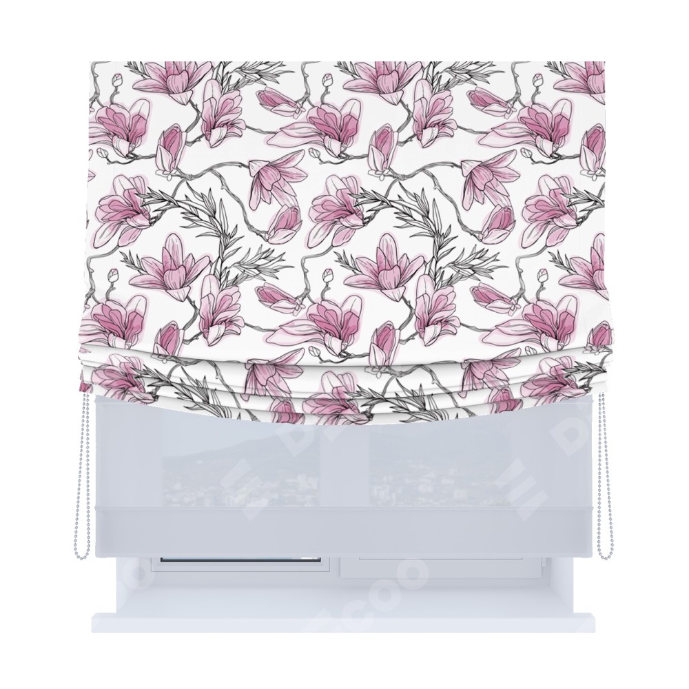 Римская штора день-ночь производителя «Cortin», используется для проёма, пошита из двух полотен, с лицевой блэкаут с нанесением сублимационной печати «Цветки магнолии», вторая ткань тюль (по стандарту комплектуется тюль белого цвета артикул V-01). Имеет универсальный механизм и подходит для монтажа: на потолок, на стену и в нишу. Удобное управление каждой шторой отдельно.