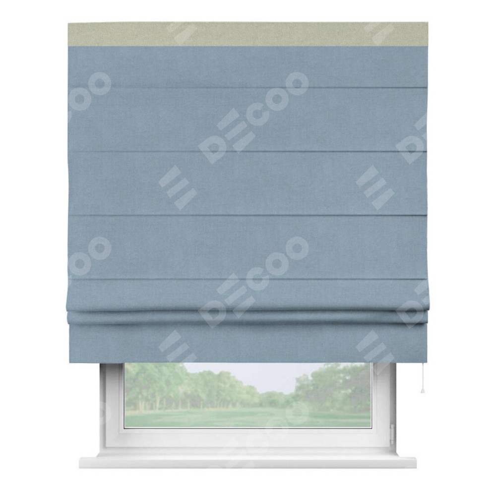 Римская штора производителя «Cortin», используется для проёма, пошита из ткани лён блэкаут голубой, артикул 69574. Отделка шторы кантом «Кинг», ткань для канта используется из льна разной расцветки на выбор. Имеет универсальный механизм и подходит для монтажа: на потолок, на стену и в нишу.
