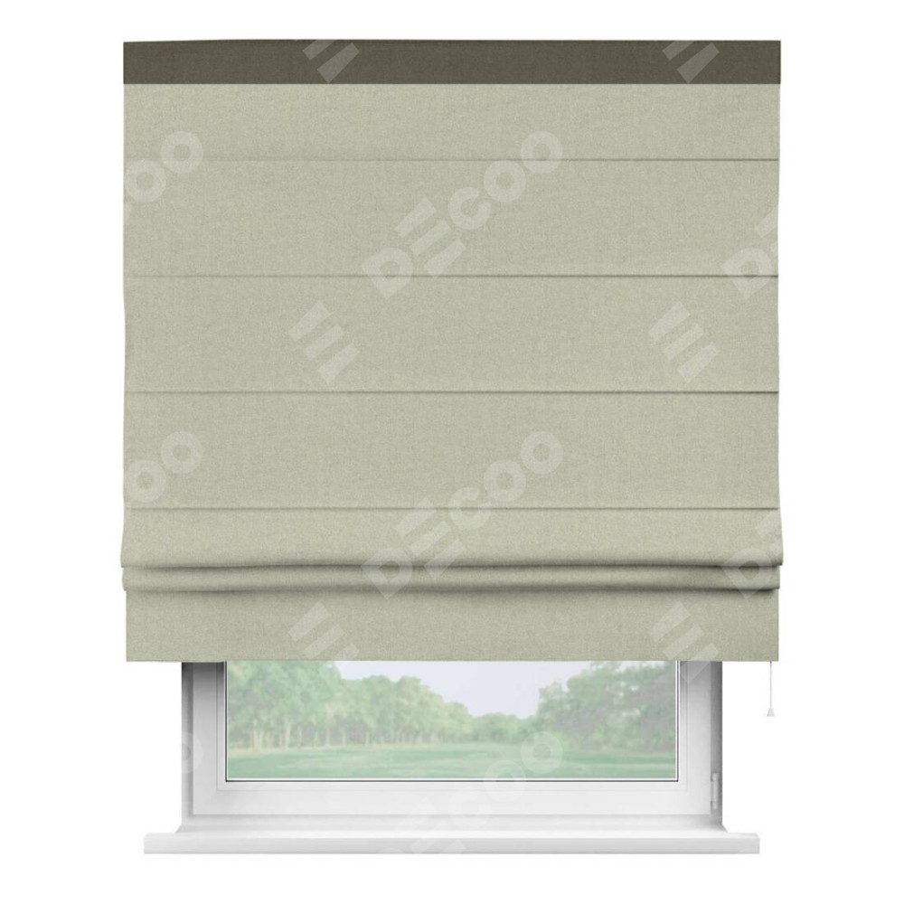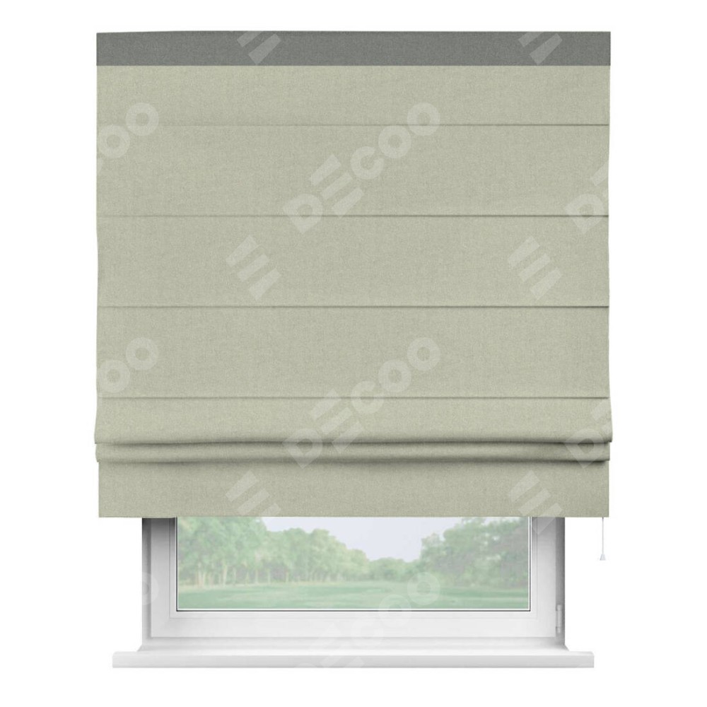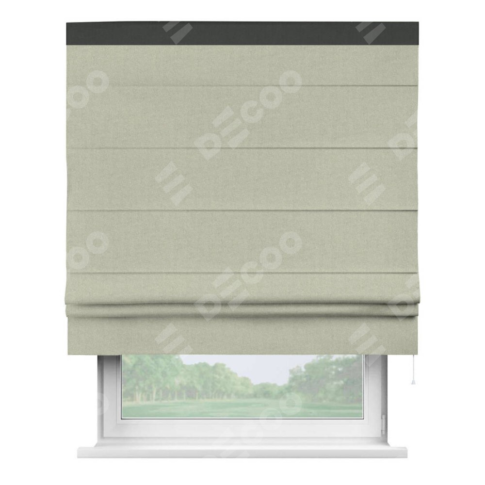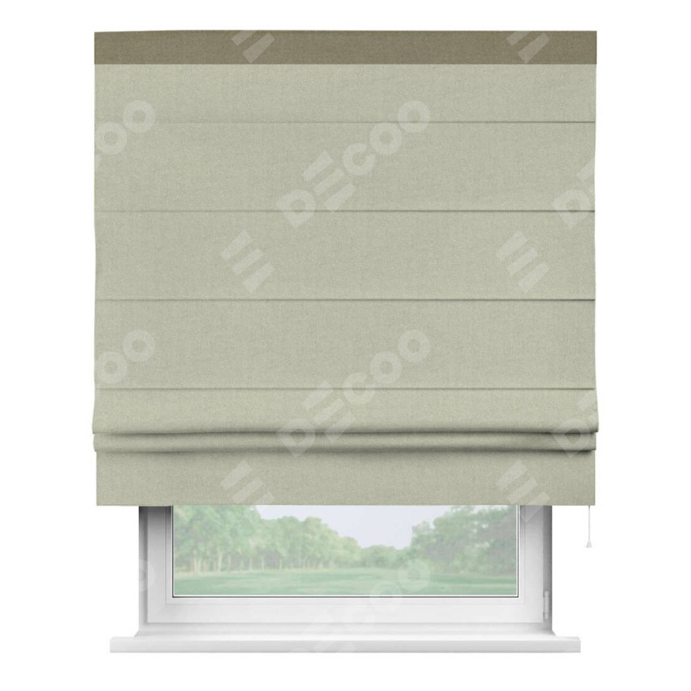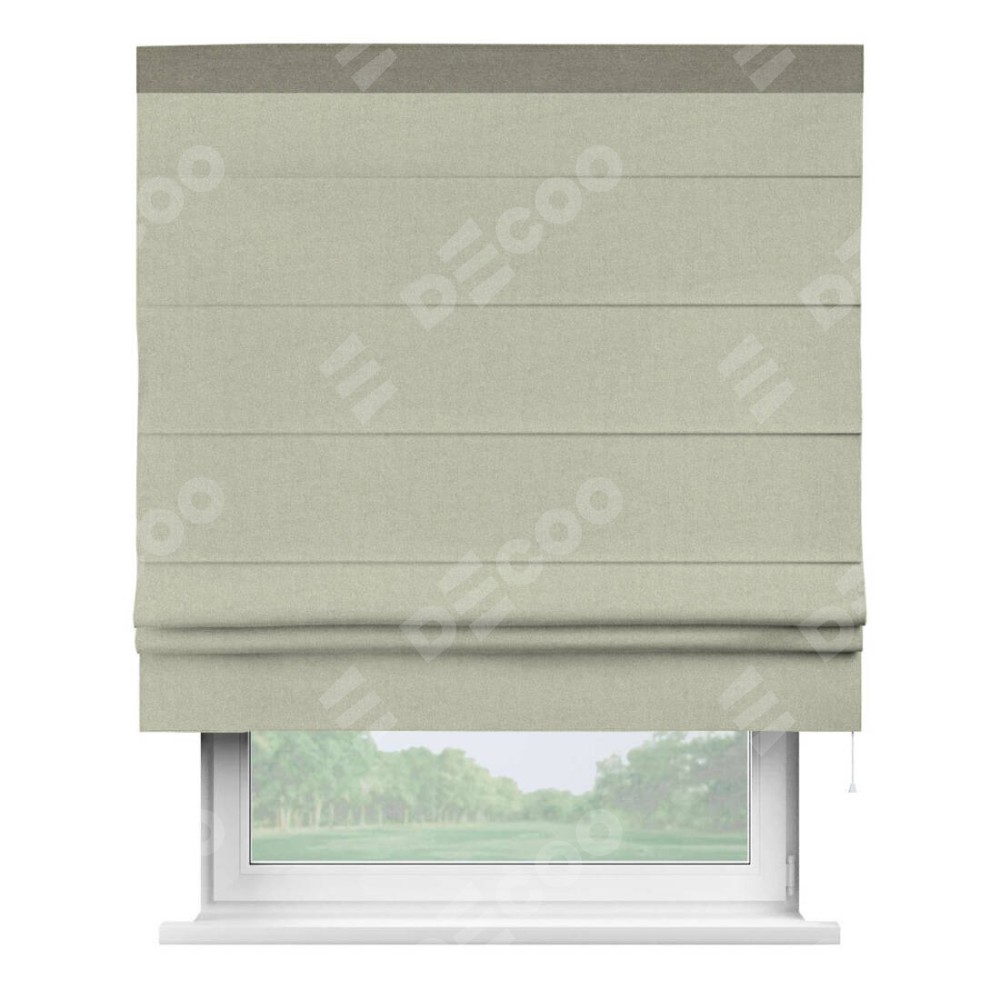 Римская штора производителя «Cortin», используется для проёма, пошита из ткани лён блэкаут серо-бежевый, артикул 69450. Отделка шторы кантом «Кинг», ткань для канта используется из льна разной расцветки на выбор. Имеет универсальный механизм и подходит для монтажа: на потолок, на стену и в нишу.