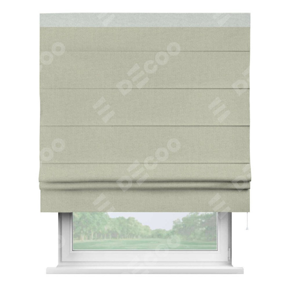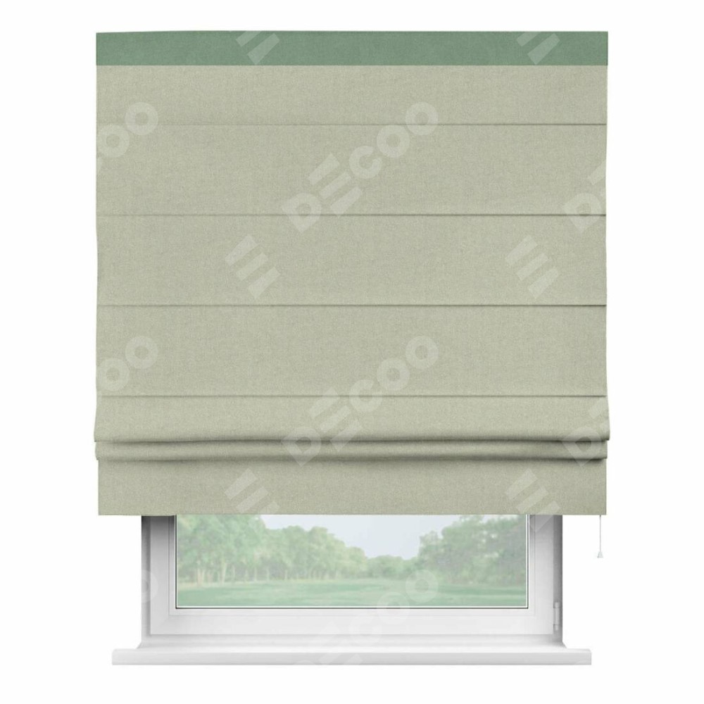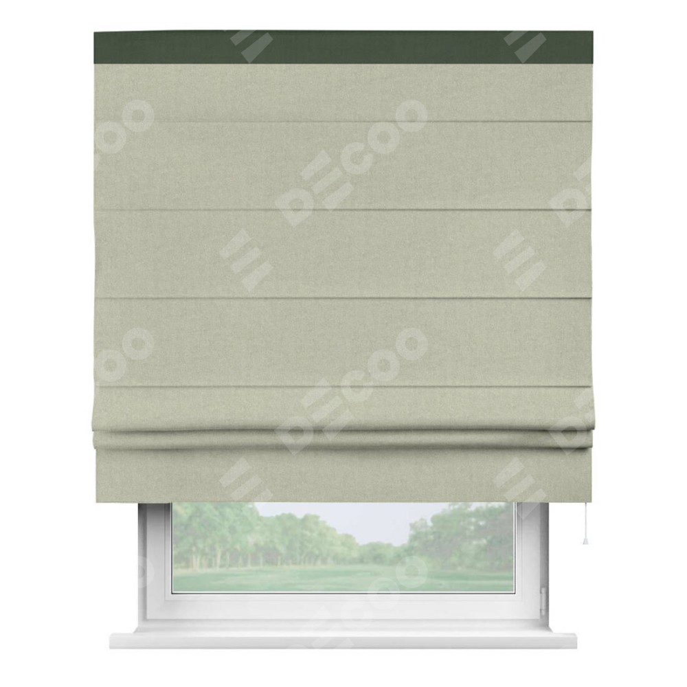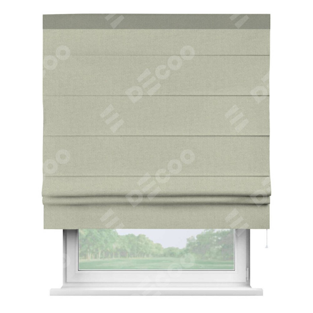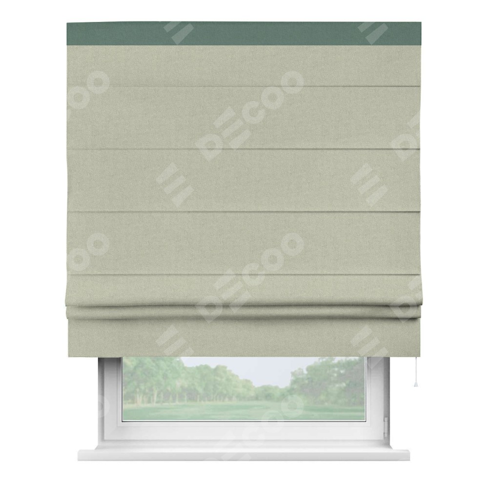 Римская штора производителя «Cortin», используется для проёма, пошита из ткани лён блэкаут серо-бежевый, артикул 69450. Отделка шторы кантом «Кинг», ткань для канта используется из льна разной расцветки на выбор. Имеет универсальный механизм и подходит для монтажа: на потолок, на стену и в нишу.