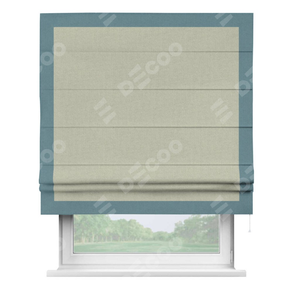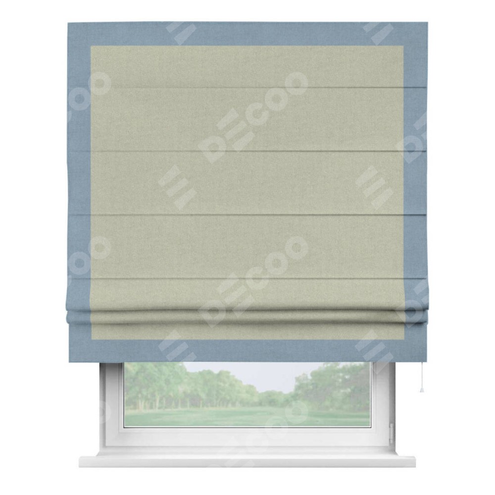 Римская штора производителя «Cortin», используется для проёма, пошита из ткани лён блэкаут серо-бежевый, артикул 69450. Отделка шторы кантом «Чесс», ткань для канта используется из льна разной расцветки на выбор. Имеет универсальный механизм и подходит для монтажа: на потолок, на стену и в нишу.