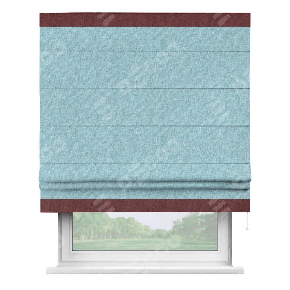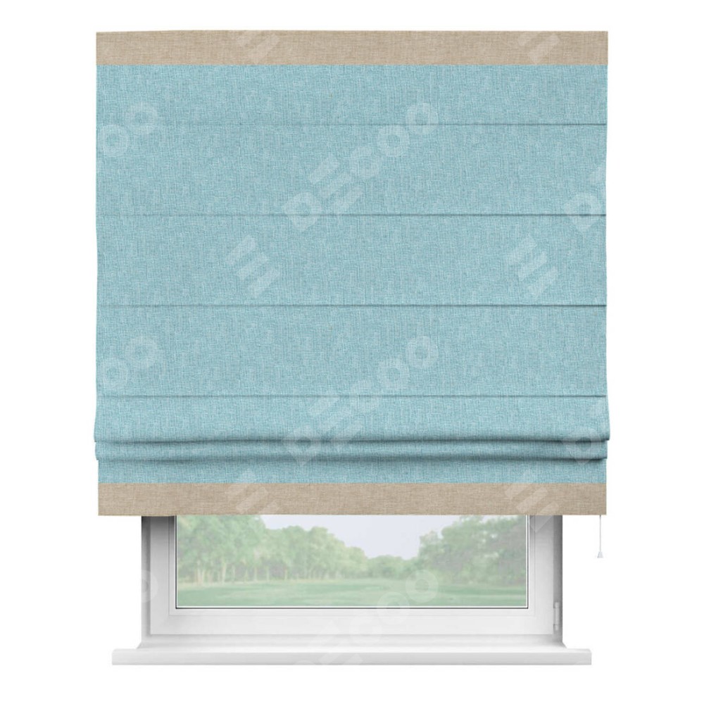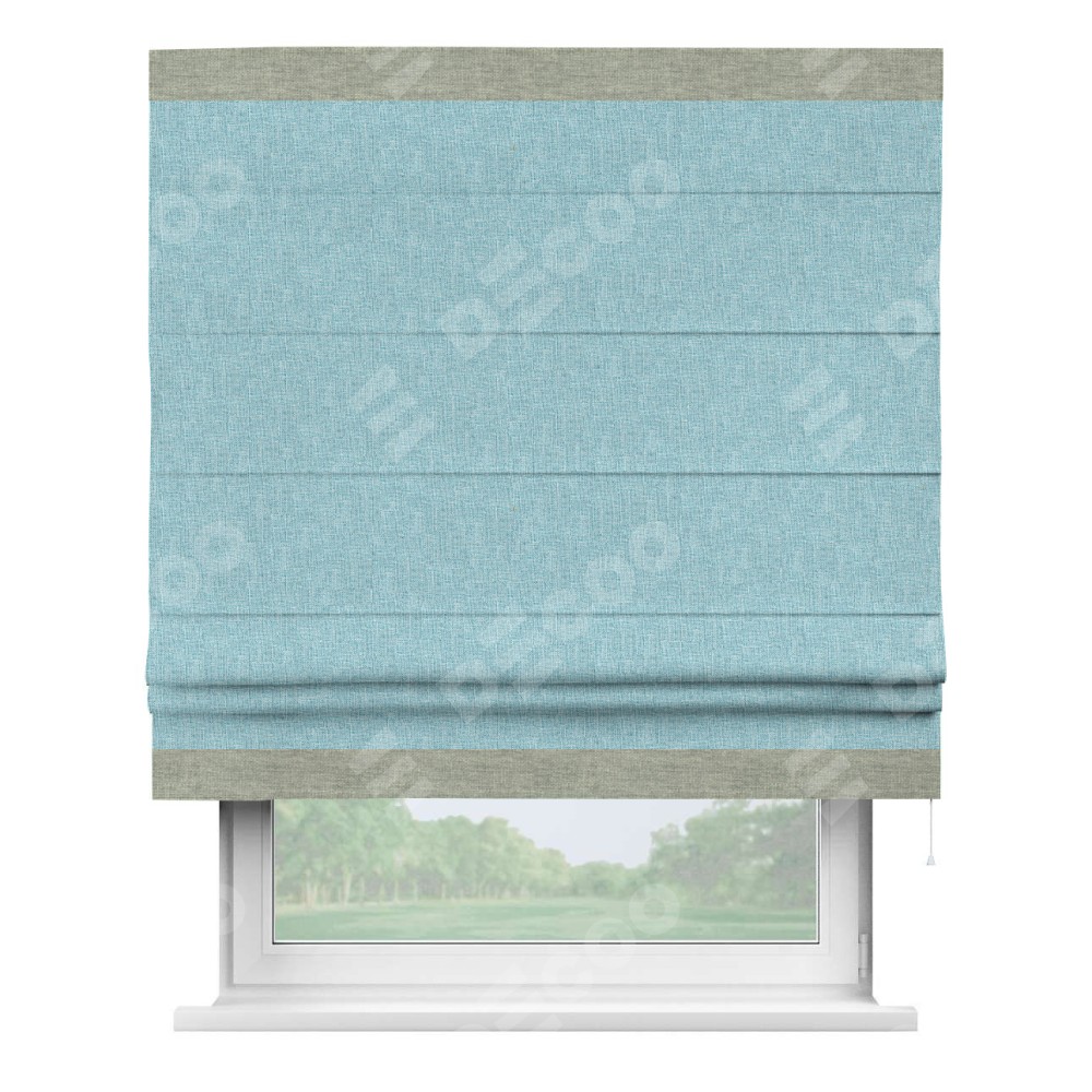 Римская штора производителя «Cortin», используется для проёма, пошита из ткани лён кашемир голубой, артикул 21616. Отделка шторы кантом «Горизонт», ткань для канта используется из льна разной расцветки на выбор. Имеет универсальный механизм и подходит для монтажа: на потолок, на стену и в нишу.