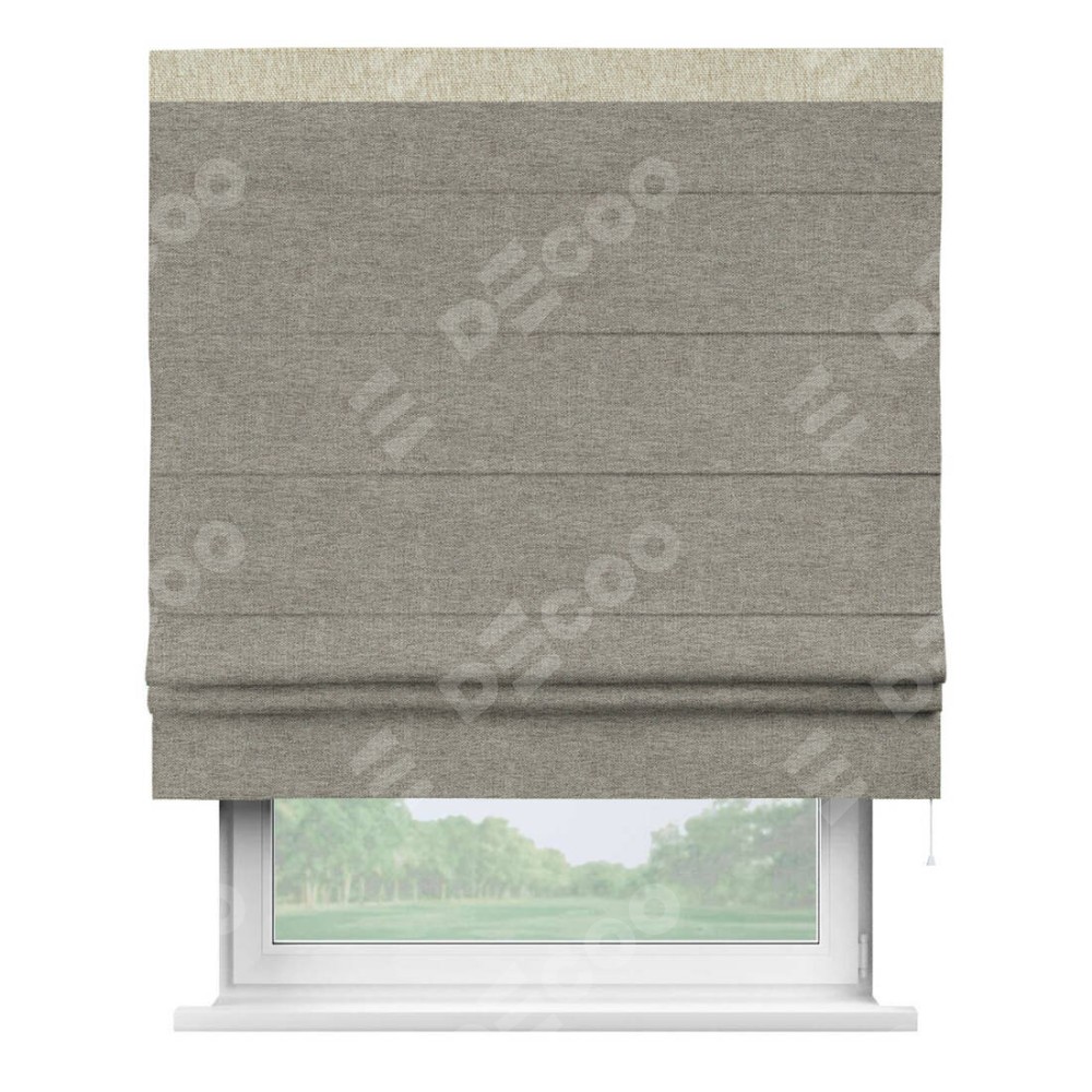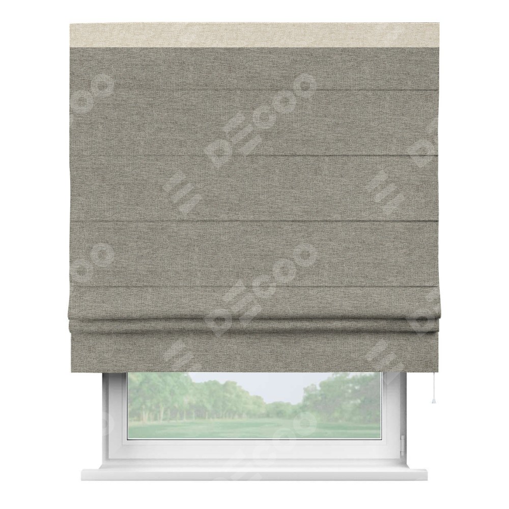 Римская штора производителя «Cortin», используется для проёма, пошита из ткани стиф димаут серо-коричневый, артикул 44028. Отделка шторы кантом «Кинг», ткань для канта используется из стифа разной расцветки на выбор. Имеет универсальный механизм и подходит для монтажа: на потолок, на стену и в нишу.