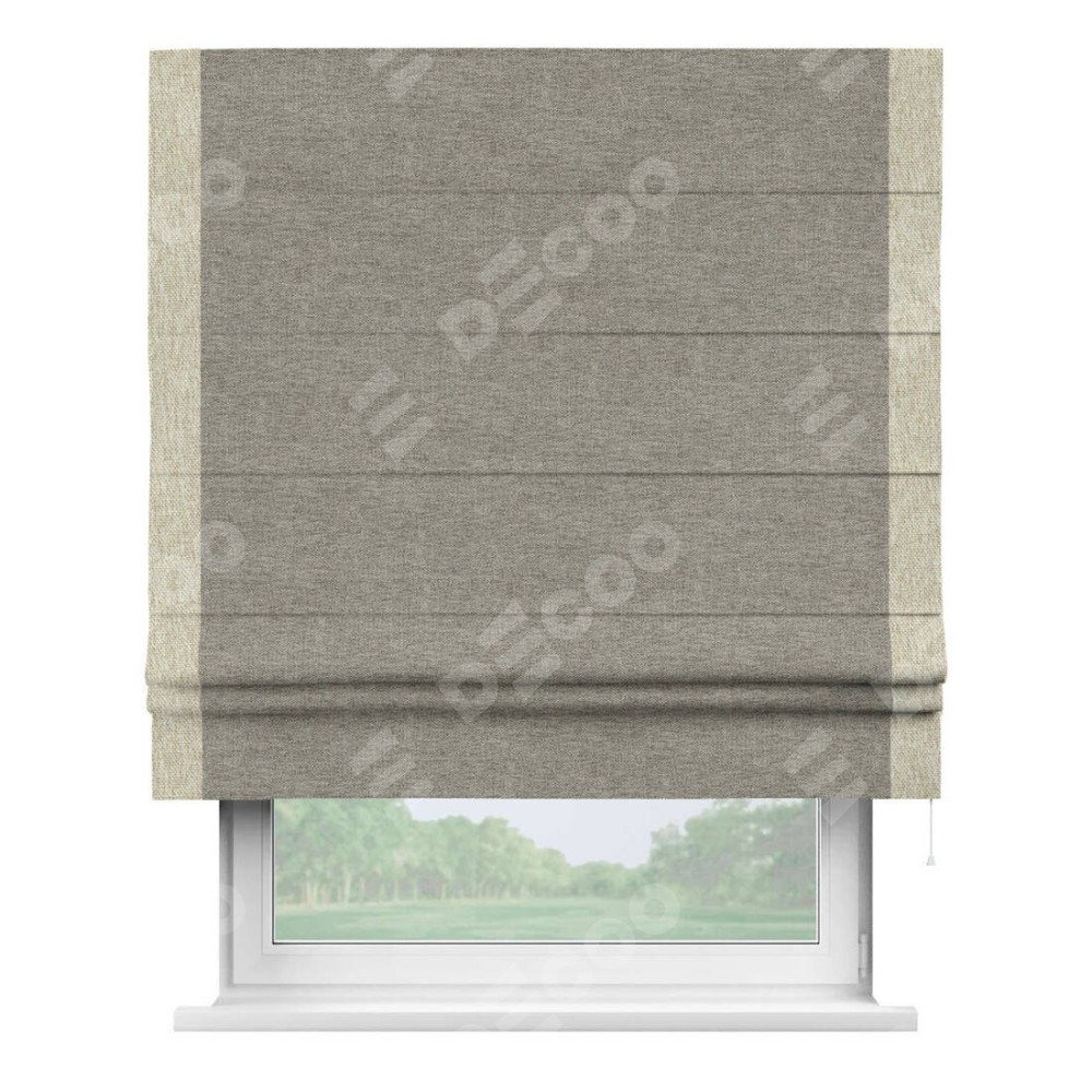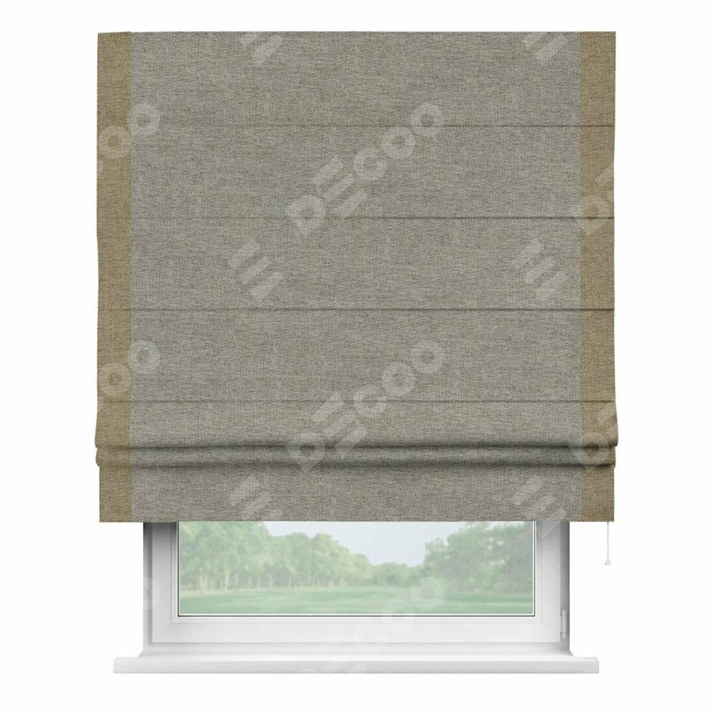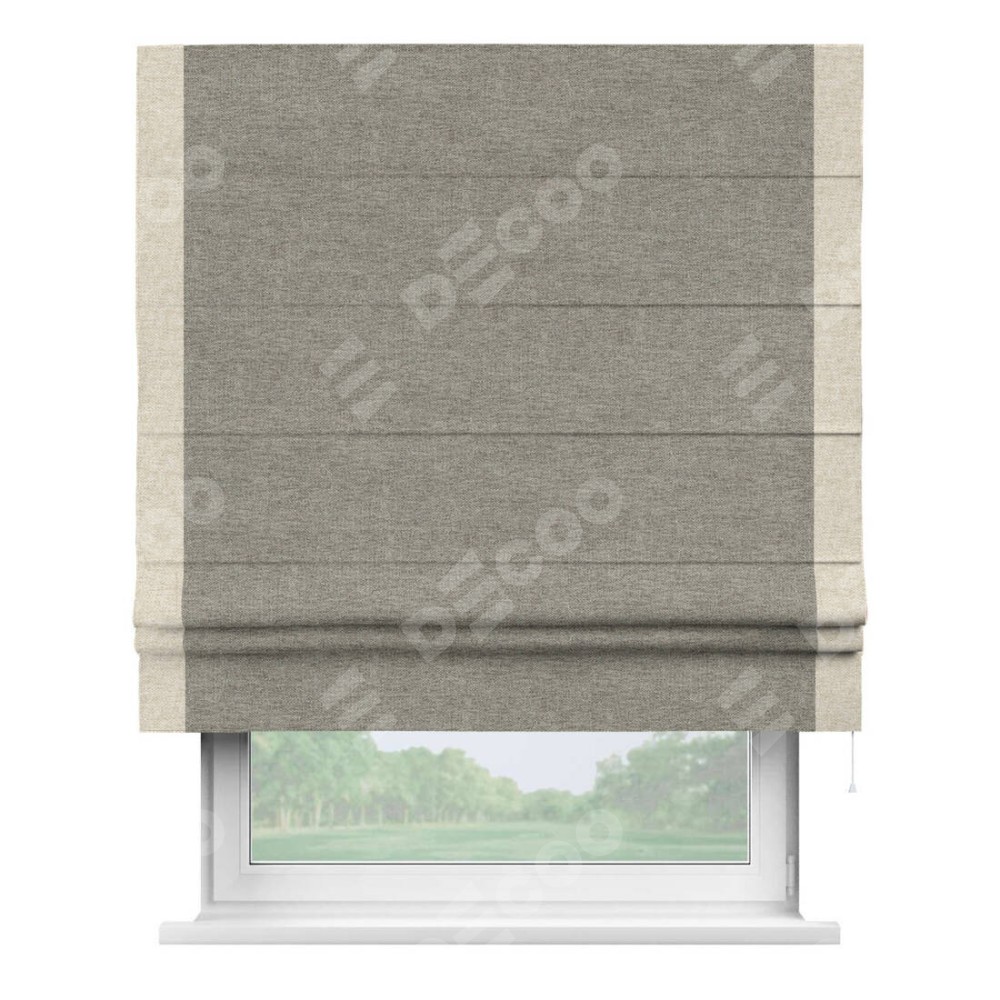 Римская штора производителя «Cortin», используется для проёма, пошита из ткани стиф димаут серо-коричневый, артикул 44028. Отделка шторы кантом «Стрим Дуо», ткань для канта используется из стифа разной расцветки на выбор. Имеет универсальный механизм и подходит для монтажа: на потолок, на стену и в нишу.