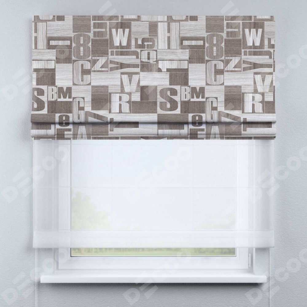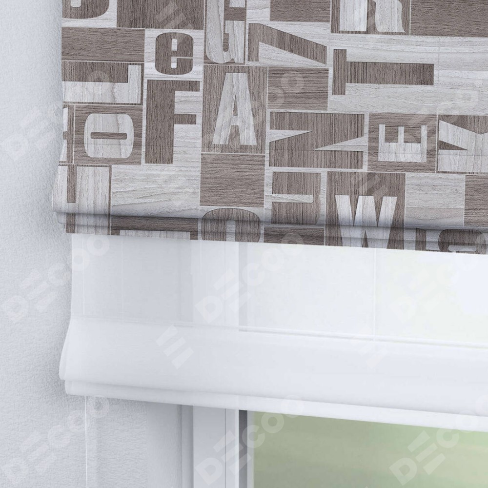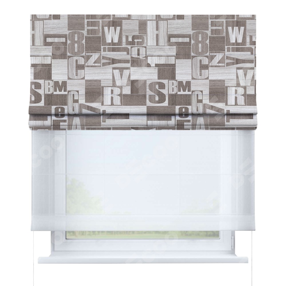 Римская штора день-ночь производителя «Cortin», используется для проёма, пошита из двух полотен, с лицевой блэкаут с нанесением сублимационной печати «Литеры лофт», вторая ткань тюль (по стандарту комплектуется тюль белого цвета артикул V-01). Имеет универсальный механизм и подходит для монтажа: на потолок, на стену и в нишу.