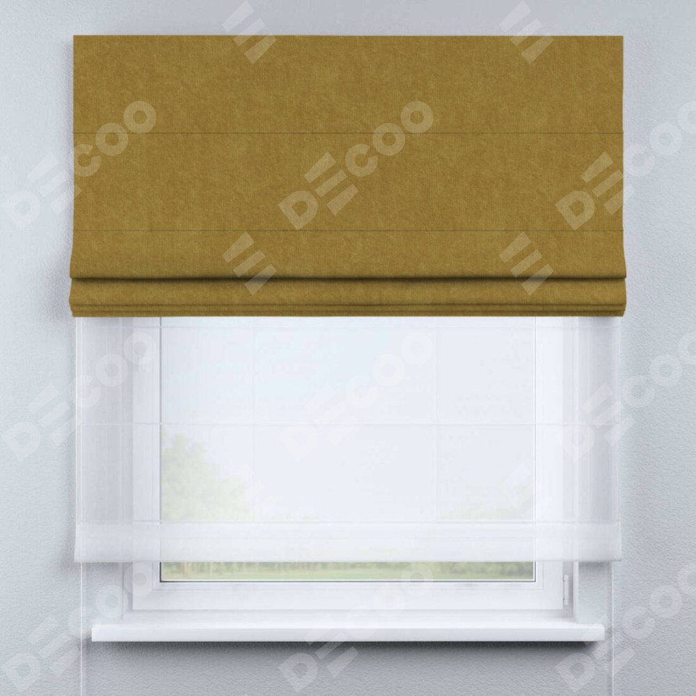 Римская штора день-ночь производителя «Cortin», используется для проёма, пошита из двух полотен, с лицевой стороны канвас горчица артикул v-476, вторая ткань тюль (по стандарту комплектуется тюль белого цвета артикул V-01). Имеет универсальный механизм и подходит для монтажа: на потолок, на стену и в нишу.