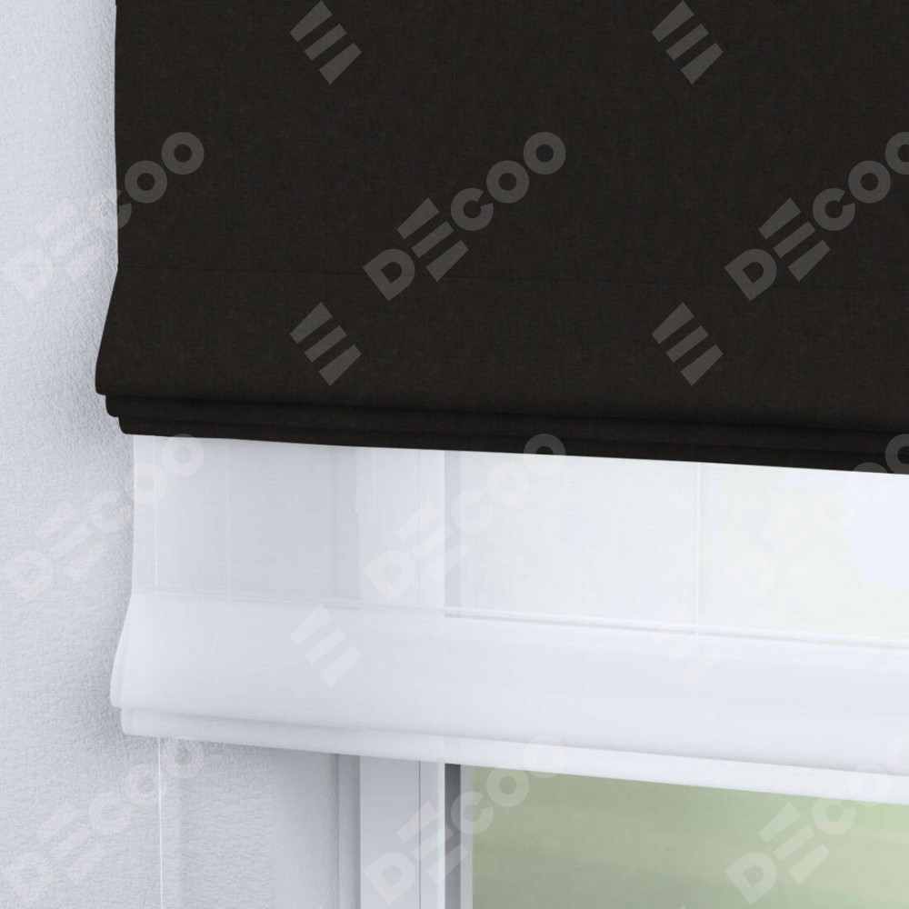 Римская штора день-ночь производителя «Cortin», используется для проёма, пошита из двух полотен, с лицевой стороны канвас тёмно-коричневый артикул v-13, вторая ткань тюль (по стандарту комплектуется тюль белого цвета артикул V-01). Имеет универсальный механизм и подходит для монтажа: на потолок, на стену и в нишу.