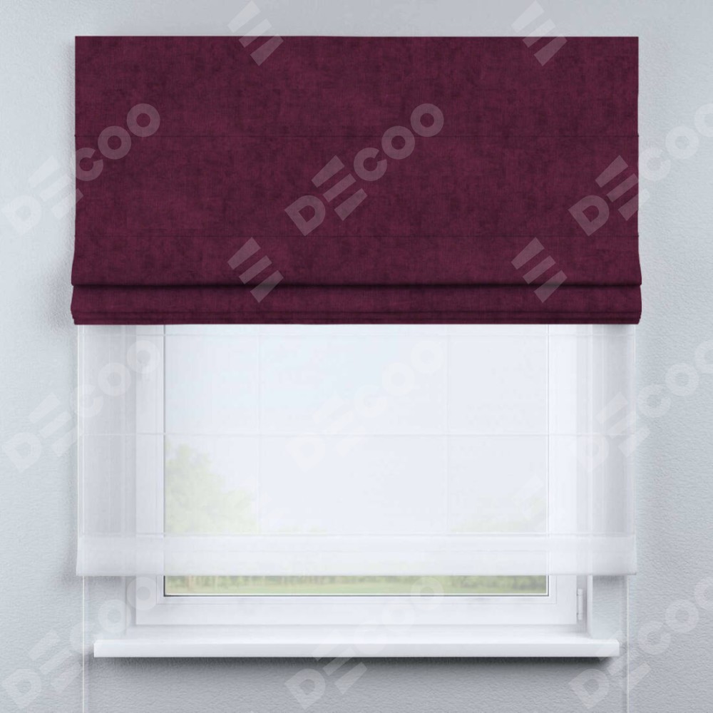 Римская штора день-ночь производителя «Cortin», используется для проёма, пошита из двух полотен, с лицевой стороны канвас фиолетовый артикул v-99, вторая ткань тюль (по стандарту комплектуется тюль белого цвета артикул V-01). Имеет универсальный механизм и подходит для монтажа: на потолок, на стену и в нишу.