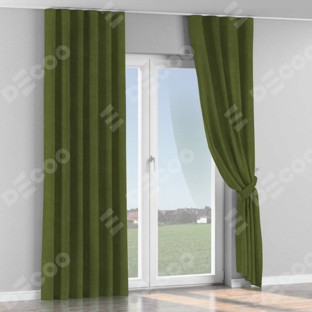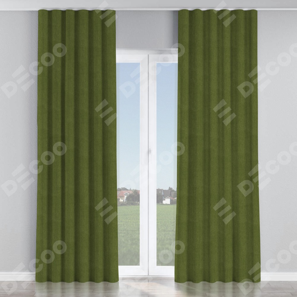 Комплект прямых штор, от производителя «Cortin», пошиты из ткани лён димаут салатовый, артикул ткани 91002. С изнаночной стороны в верхней части штор пристрачивается шторная лента с декоративными складками «Волна». Для создания элегантных складок прямые шторы шьются по стандарту с коэффициентом 1:2 (на 100 см. ширины проёма 200 см. ширины ткани).