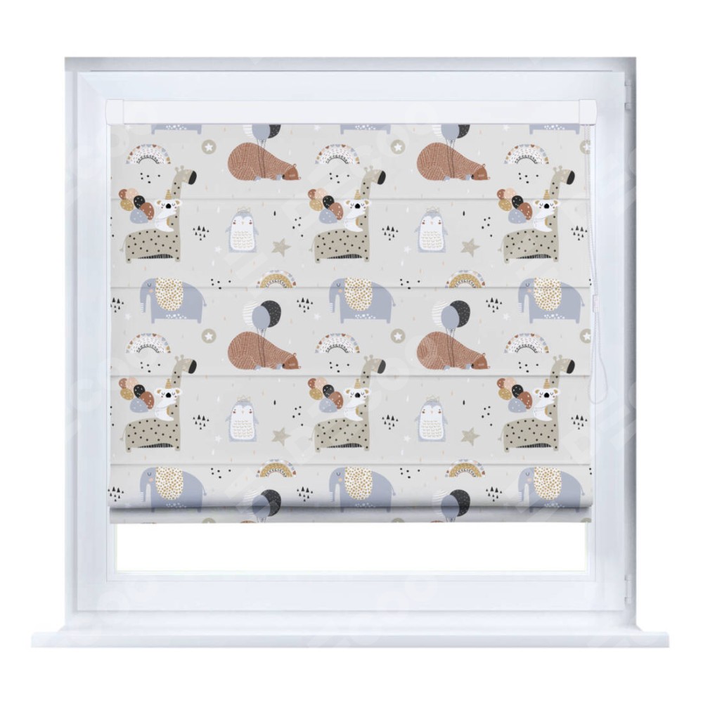 Римская штора производителя «Cortin», устанавливается на створку окна, пошита из ткани блэкаут с нанесением сублимационной печати «Вечеринка животных». Штора шьётся по индивидуальным размерам, для данного типа римской шторы возможная ширина от 35 до 150 см., высота до 250 см.