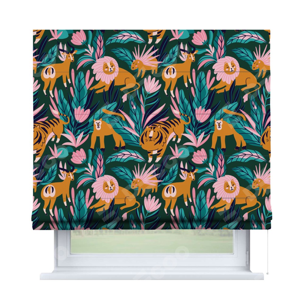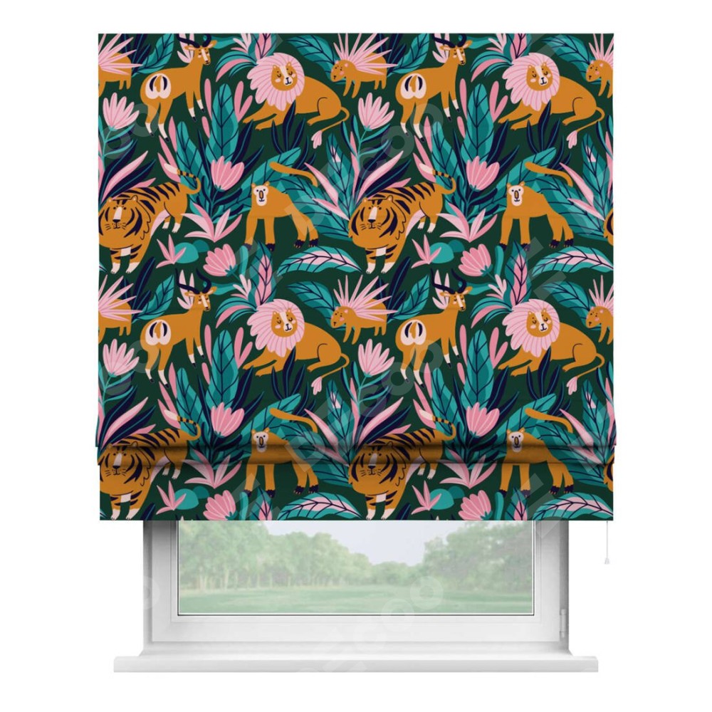 Римская штора производителя «Cortin», используется для проёма, пошита из ткани блэкаут с нанесением сублимационной печати «Дикие животные». Имеет универсальный механизм и подходит для монтажа: на потолок, на стену и в нишу.