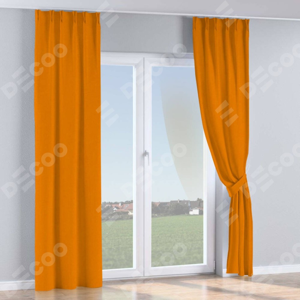 Комплект прямых штор, от производителя «Cortin», пошиты из ткани канвас оранжевый, артикул ткани v-106. С изнаночной стороны в верхней части штор пристрачивается шторная лента с декоративными складками «Кустик». Для создания элегантных складок прямые шторы шьются по стандарту с коэффициентом 1:2 (на 100 см. ширины проёма 200 см. ширины ткани).