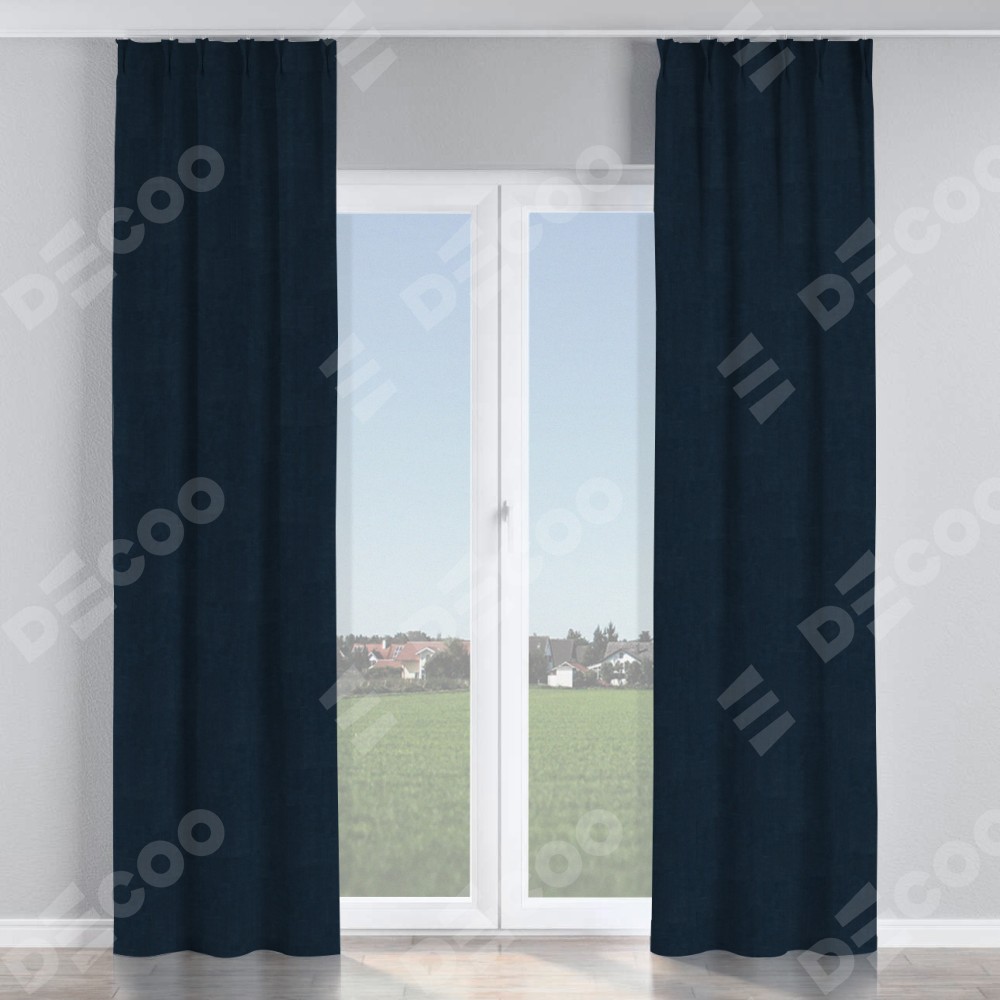 Комплект прямых штор, от производителя «Cortin», пошиты из ткани канвас тёмно-синий, артикул ткани v-206. С изнаночной стороны в верхней части штор пристрачивается шторная лента с декоративными складками «Кустик». Для создания элегантных складок прямые шторы шьются по стандарту с коэффициентом 1:2 (на 100 см. ширины проёма 200 см. ширины ткани).