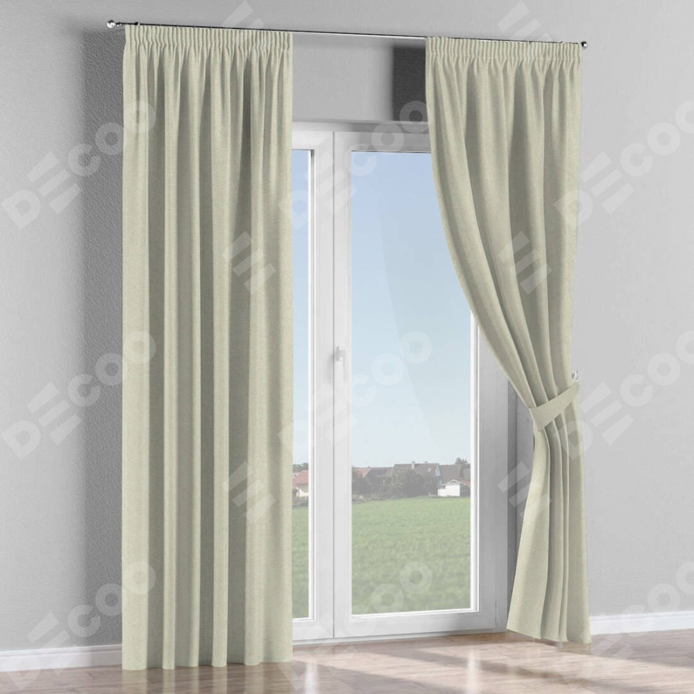 Комплект прямых штор, от производителя «Cortin», пошиты из ткани твид блэкаут шампань, артикул ткани 90929. С изнаночной стороны в верхней части штор пристрачивается шторная лента с декоративными складками «Карандаш». Для создания элегантных складок прямые шторы шьются по стандарту с коэффициентом 1:2 (на 100 см. ширины проёма 200 см. ширины ткани).
