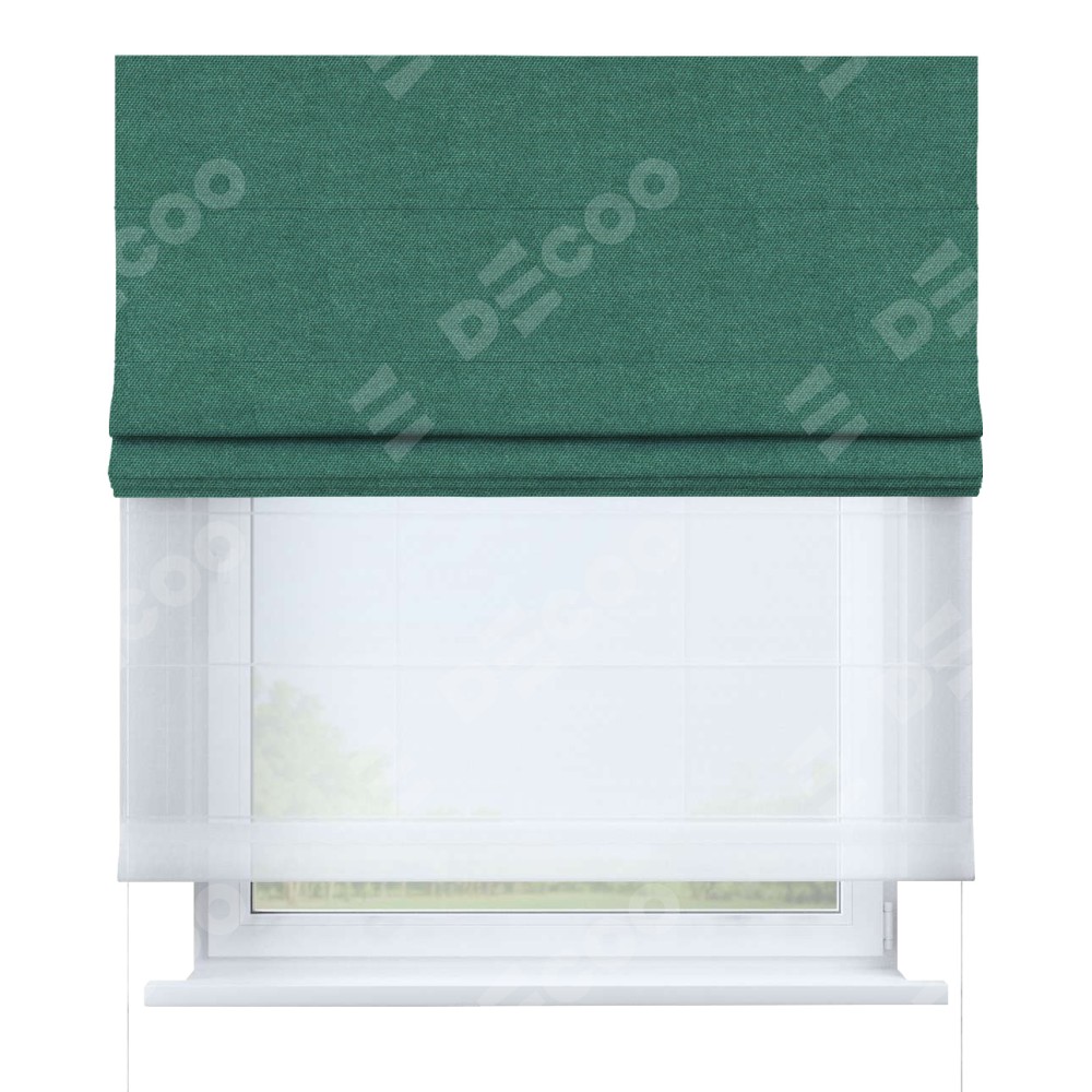 Двойная римская штора «День-ночь» от производителя Cortin предназначена для использования в проёмах. Эта штора уникальна тем, что состоит из двух полотен. На лицевой стороне находится лён димаут светло-бирюзовый (артикул: 91005), обеспечивающий эффективное затемнение. В комплект также входит вторая ткань — легкий белый тюль (артикул: V-01), который добавляет изящества и легкости оформлению окна. Кроме того, доступны и другие разновидности ткани тюль, выбор которых доступен по  ссылке .