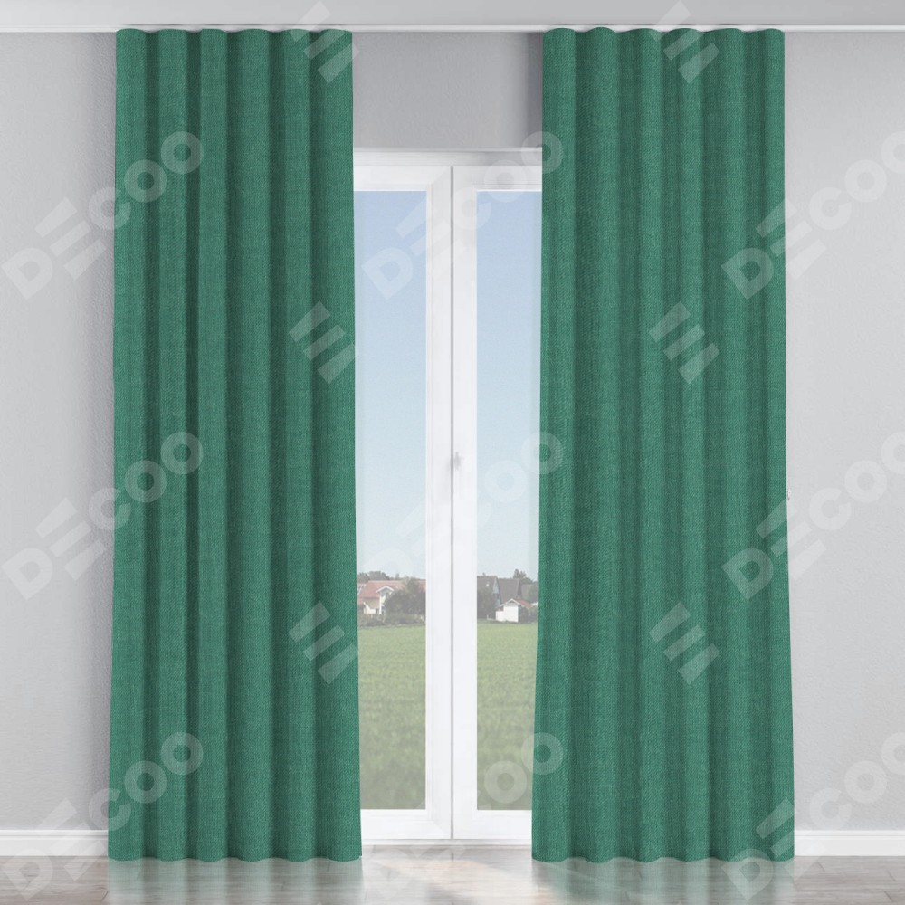 Комплект прямых штор, от производителя «Cortin», пошиты из ткани лён димаут светло-бирюзовый, артикул ткани 91005. С изнаночной стороны в верхней части штор пристрачивается шторная лента с декоративными складками «Волна». Для создания элегантных складок прямые шторы шьются по стандарту с коэффициентом 1:2 (на 100 см. ширины проёма 200 см. ширины ткани).