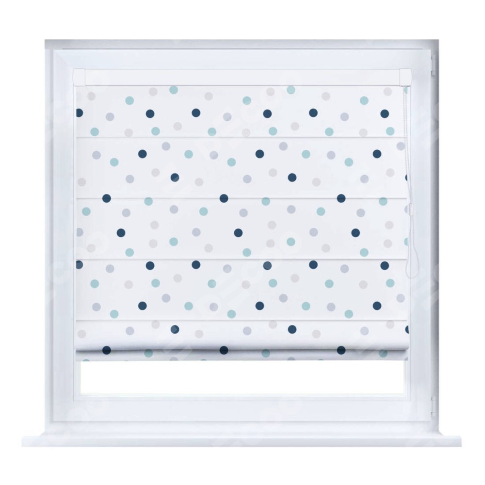 Римская штора производителя «Cortin», устанавливается на створку окна, пошита из ткани блэкаут с нанесением сублимационной печати «Точки». Штора шьётся по индивидуальным размерам, для данного типа римской шторы возможная ширина от 35 до 150 см., высота до 250 см.