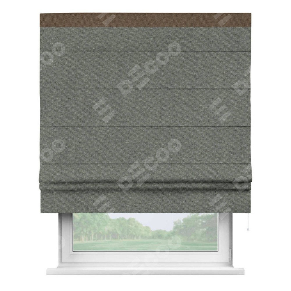 Римская штора производителя «Cortin», используется для проёма, пошита из ткани лён димаут тёмно-серый, артикул 91011. Отделка шторы кантом «Кинг», ткань для канта используется из льна димаут разной расцветки на выбор. Имеет универсальный механизм и подходит для монтажа: на потолок, на стену и в нишу.