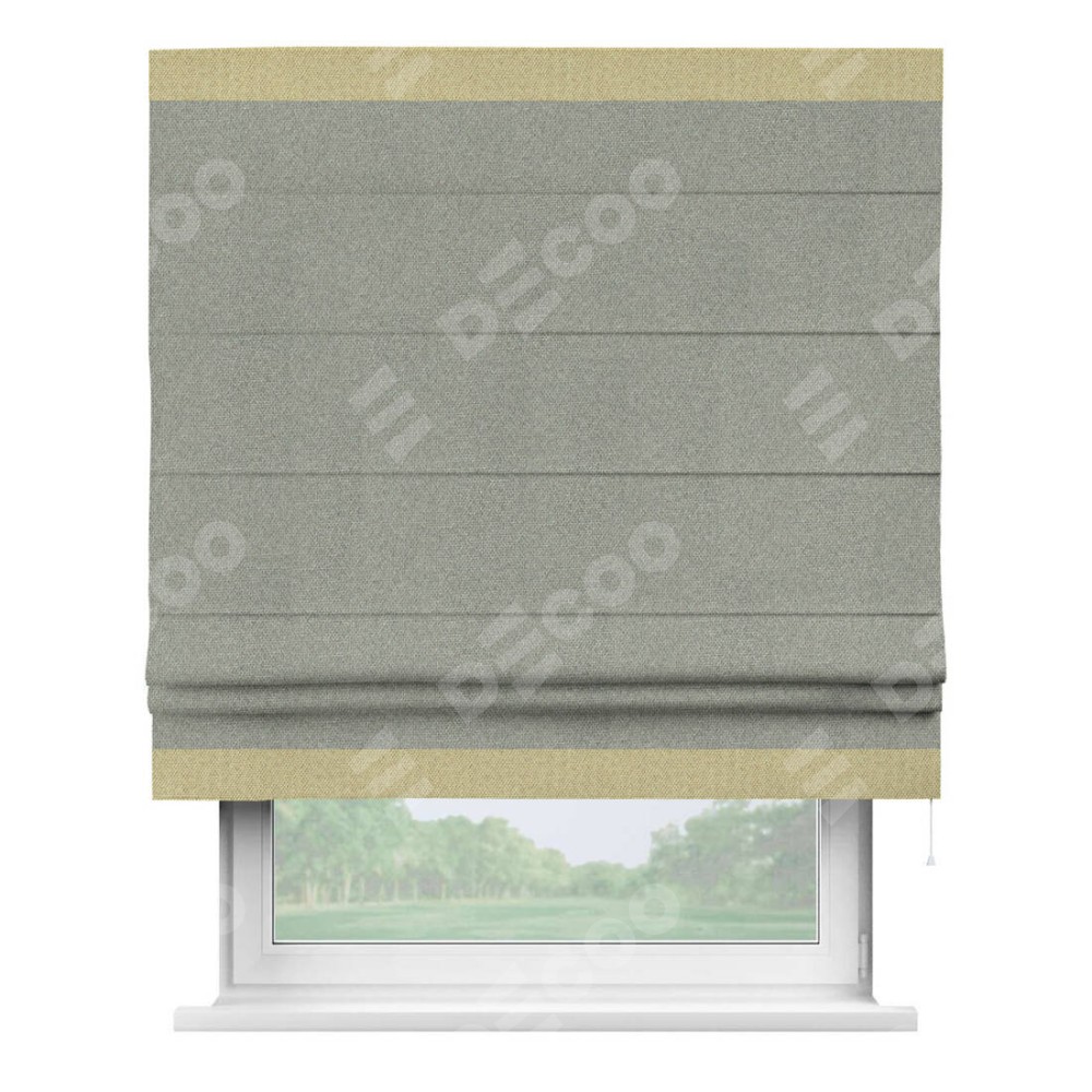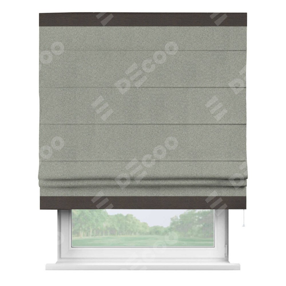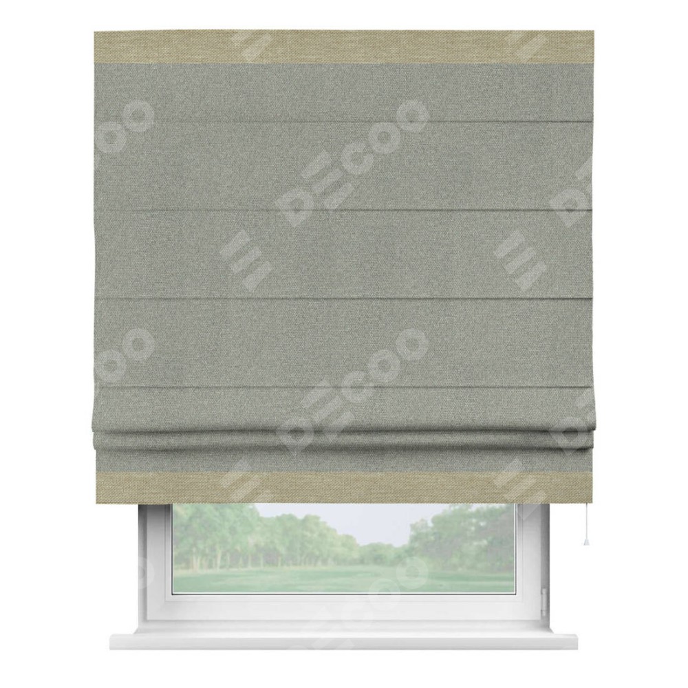 Римская штора производителя «Cortin», используется для проёма, пошита из ткани лён димаут серый, артикул 91009. Отделка шторы кантом «Горизонт», ткань для канта используется из льна димаут разной расцветки на выбор. Имеет универсальный механизм и подходит для монтажа: на потолок, на стену и в нишу.