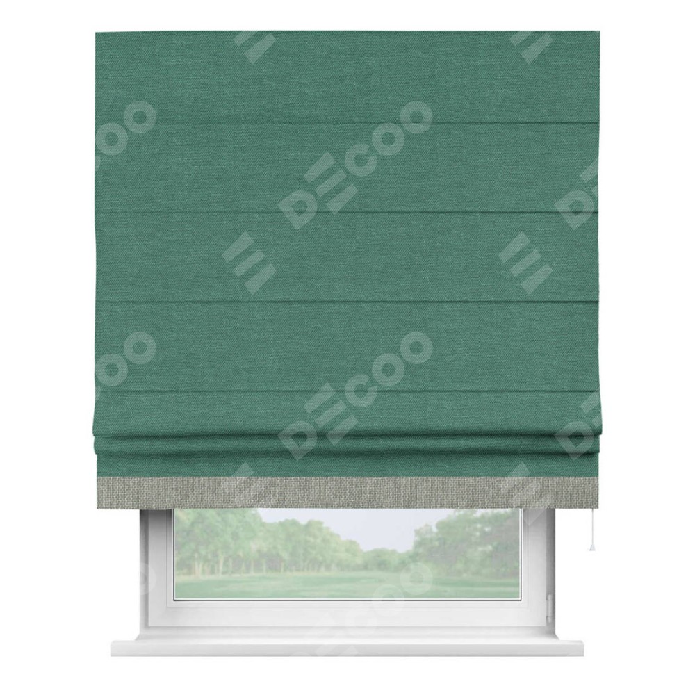 Римская штора производителя «Cortin», используется для проёма, пошита из ткани лён димаут светло-бирюзовый, артикул 91005. Отделка шторы кантом «Джестер», ткань для канта используется из льна димаут разной расцветки на выбор. Имеет универсальный механизм и подходит для монтажа: на потолок, на стену и в нишу.
