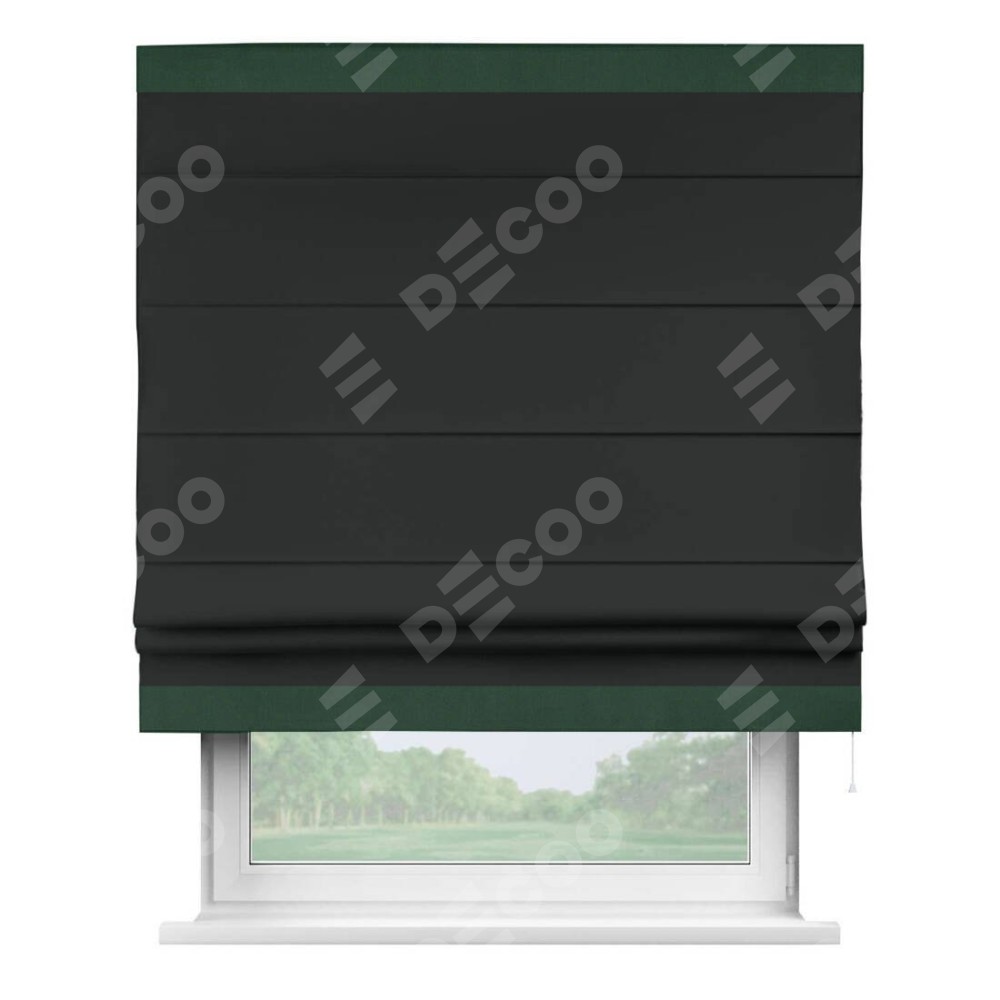 Римская штора производителя «Cortin», используется для проёма, пошита из ткани блэкаут однотонный черный, артикул ткани 91571−2. Отделка шторы кантом «Горизонт», ткань для канта используется из блэкаута однотонного разной расцветки на выбор. Имеет универсальный механизм и подходит для монтажа: на потолок, на стену и в нишу.