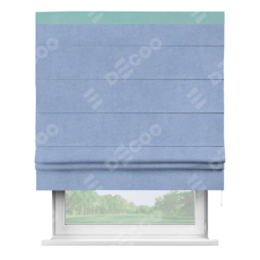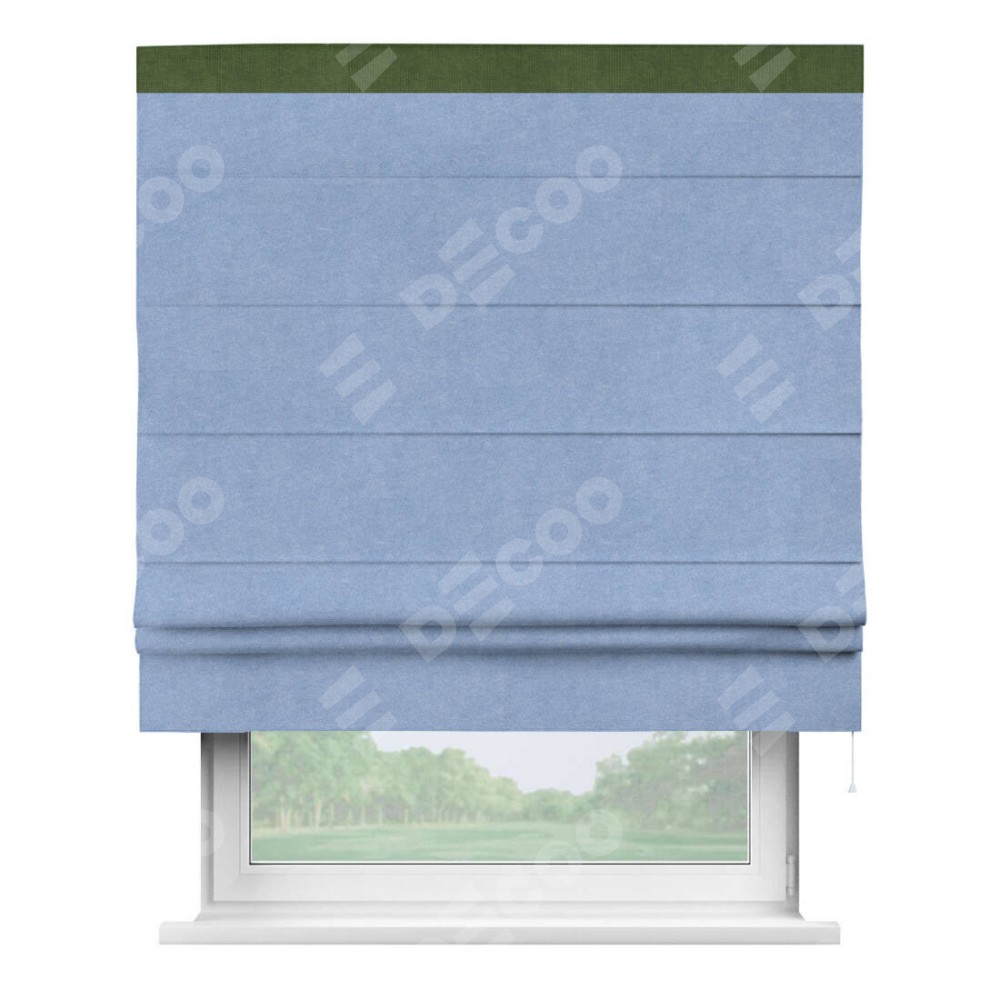 Римская штора производителя «Cortin», используется для проёма, пошита из ткани вельвет васильковый, артикул ткани 33799. Отделка шторы кантом «Кинг», ткань для канта используется из вельвета разной расцветки на выбор. Имеет универсальный механизм и подходит для монтажа: на потолок, на стену и в нишу.