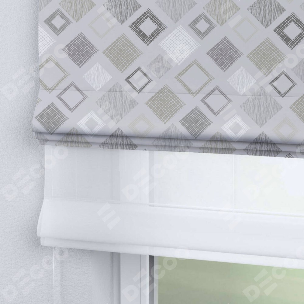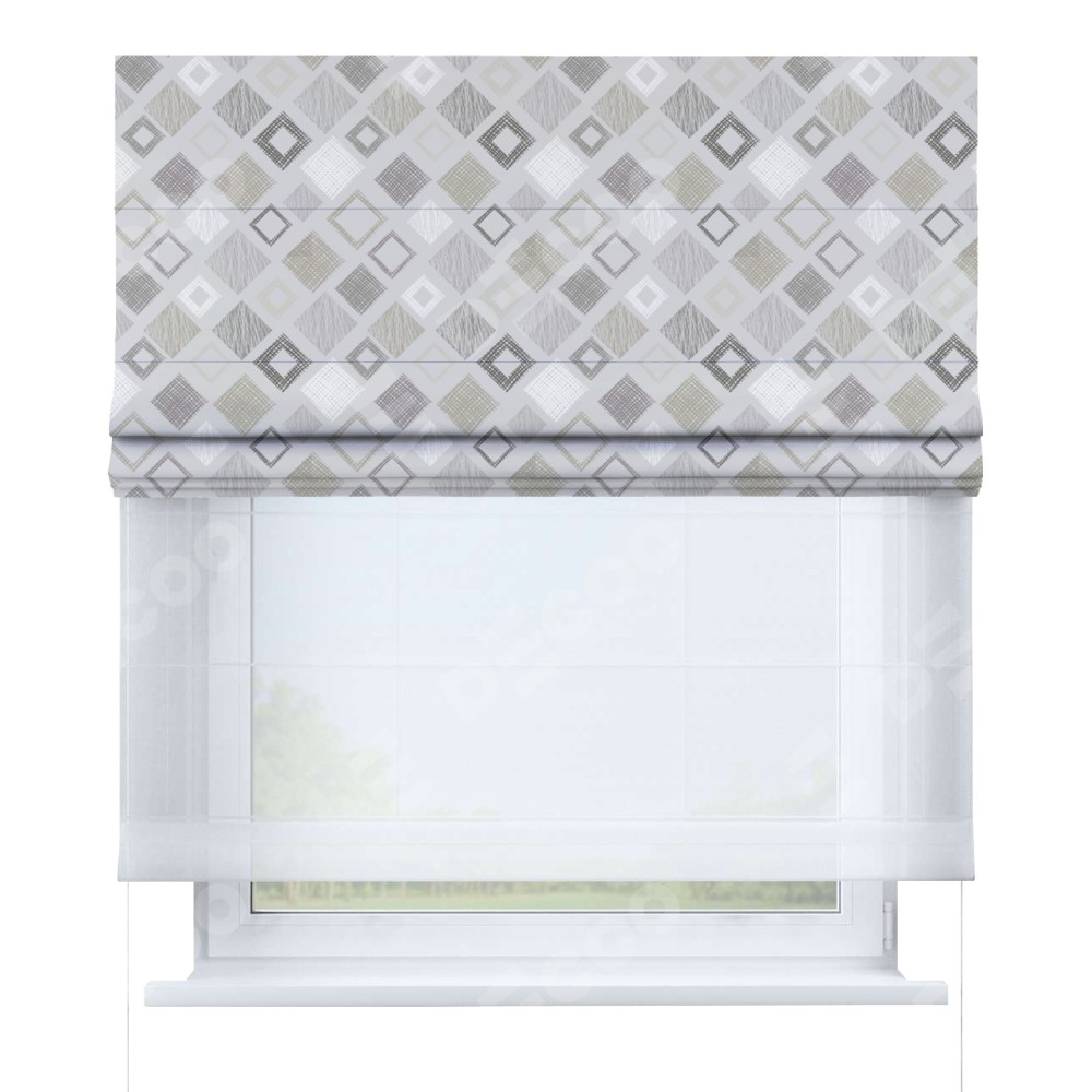 Двойная римская штора «День-ночь» от производителя Cortin предназначена для использования в проёмах. Эта штора уникальна тем, что состоит из двух полотен. На лицевой стороне находится блэкаут с нанесением сублимационной печати «Квадро», обеспечивающий эффективное затемнение. В комплект также входит вторая ткань — легкий белый тюль (артикул: V-01), который добавляет изящества и легкости оформлению окна. Кроме того, доступны и другие разновидности ткани тюль, выбор которых доступен по ссылке .