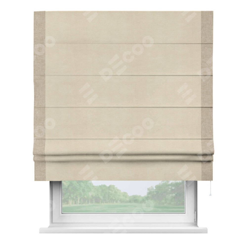 Римская штора производителя «Cortin», используется для проёма, пошита из ткани лён кашемир шампань, артикул 17205. Отделка шторы кантом «Стрим Дуо», ткань для канта используется из льна разной расцветки на выбор. Имеет универсальный механизм и подходит для монтажа: на потолок, на стену и в нишу.
