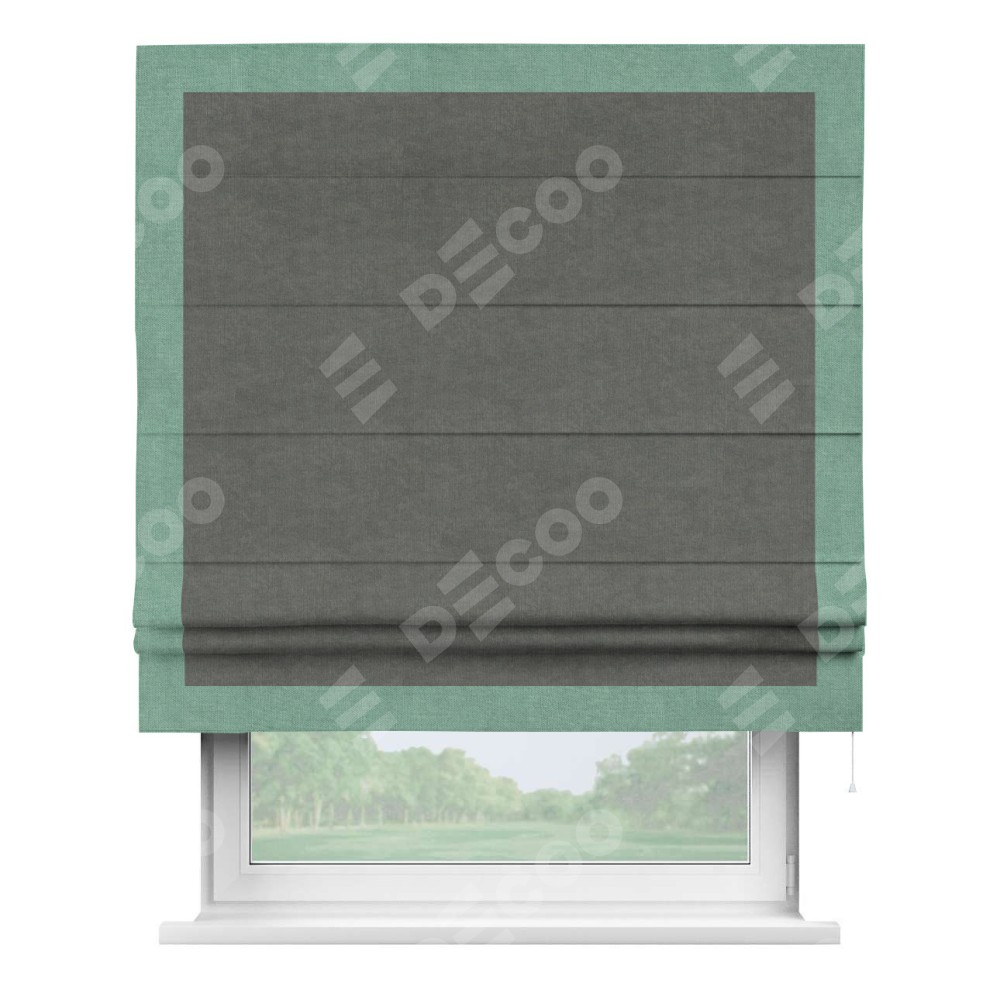 Римская штора производителя «Cortin», используется для проёма, пошита из ткани канвас тёмно-серый, артикул ткани v-340. Отделка шторы кантом «Чесс» (мятный v-248), ткань для канта используется из канваса разной расцветки на выбор. Имеет универсальный механизм и подходит для монтажа: на потолок, на стену и в нишу.
