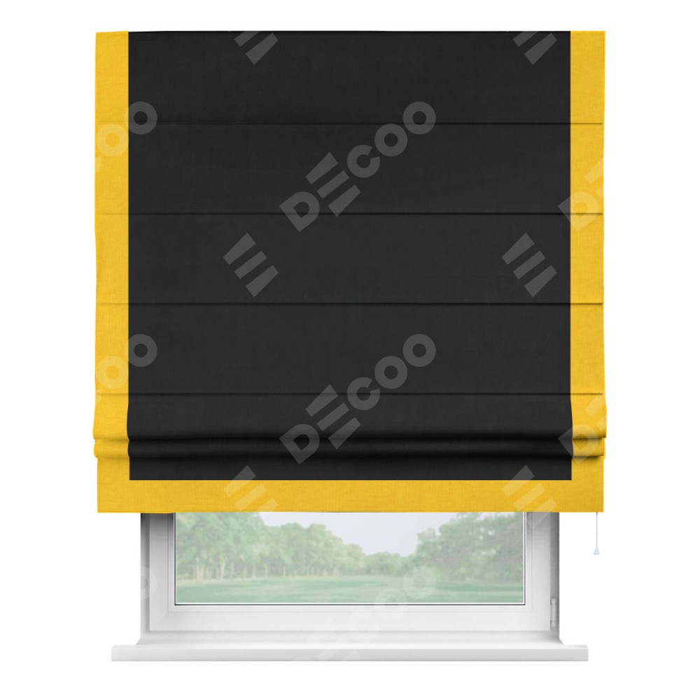 Римская штора производителя «Cortin», используется для проёма, пошита из ткани канвас черный, артикул ткани v-194. Отделка шторы кантом «Виктория» (желтый v-344), ткань для канта используется из канваса разной расцветки на выбор. Имеет универсальный механизм и подходит для монтажа: на потолок, на стену и в нишу.