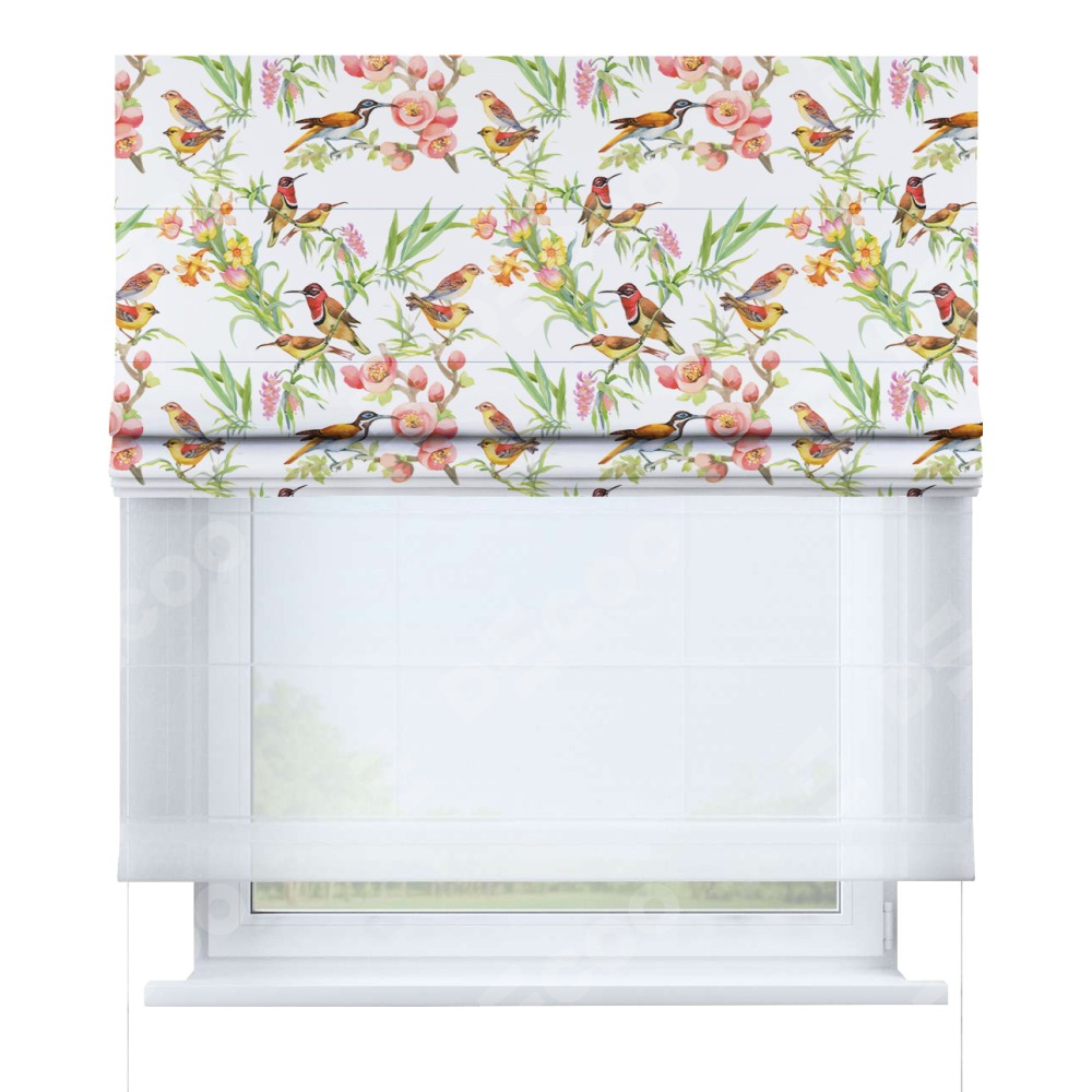 Двойная римская штора «День-ночь» от производителя Cortin предназначена для использования в проёмах. Эта штора уникальна тем, что состоит из двух полотен. На лицевой стороне находится блэкаут с нанесением сублимационной печати «Певчие птички», обеспечивающий эффективное затемнение. В комплект также входит вторая ткань — легкий белый тюль (артикул: V-01), который добавляет изящества и легкости оформлению окна. Кроме того, доступны и другие разновидности ткани тюль, выбор которых доступен по ссылке .