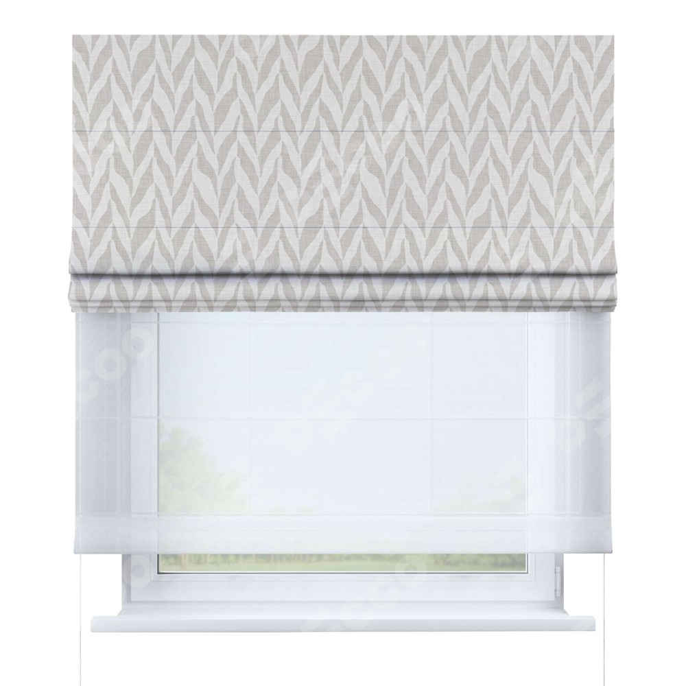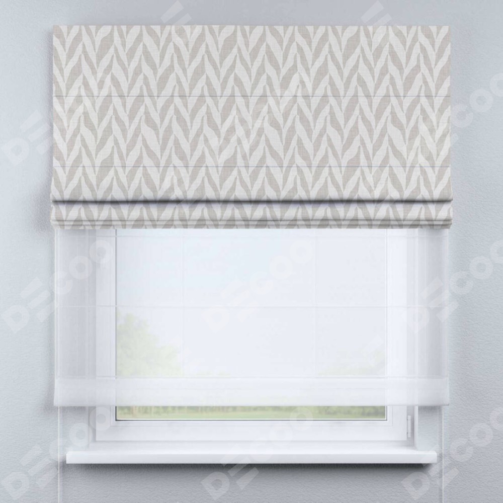 Двойная римская штора «День-ночь» от производителя Cortin предназначена для использования в проёмах. Эта штора уникальна тем, что состоит из двух полотен. На лицевой стороне находится блэкаут с нанесением сублимационной печати «Песочный зебрано», обеспечивающий эффективное затемнение. В комплект также входит вторая ткань — легкий белый тюль (артикул: V-01), который добавляет изящества и легкости оформлению окна. Кроме того, доступны и другие разновидности ткани тюль, выбор которых доступен по ссылке .