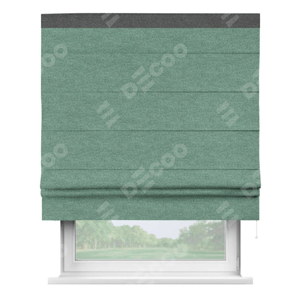 Римская штора производителя «Cortin», используется для проёма, пошита из ткани твид блэкаут бирюзовый, артикул 90934. Отделка шторы кантом «Кинг», ткань для канта используется из твида разной расцветки на выбор. Имеет универсальный механизм и подходит для монтажа: на потолок, на стену и в нишу.