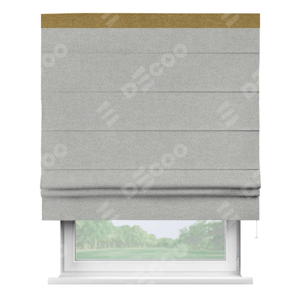Римская штора производителя «Cortin», используется для проёма, пошита из ткани твид блэкаут светло-серый, артикул 90936. Отделка шторы кантом «Кинг», ткань для канта используется из твида разной расцветки на выбор. Имеет универсальный механизм и подходит для монтажа: на потолок, на стену и в нишу.