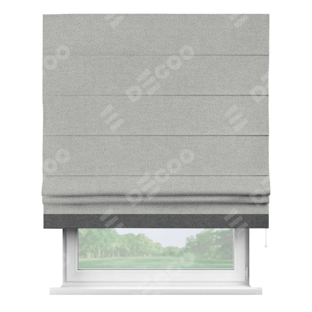 Римская штора производителя «Cortin», используется для проёма, пошита из ткани твид блэкаут светло-серый, артикул 90936. Отделка шторы кантом «Джестер», ткань для канта используется из твида разной расцветки на выбор. Имеет универсальный механизм и подходит для монтажа: на потолок, на стену и в нишу.