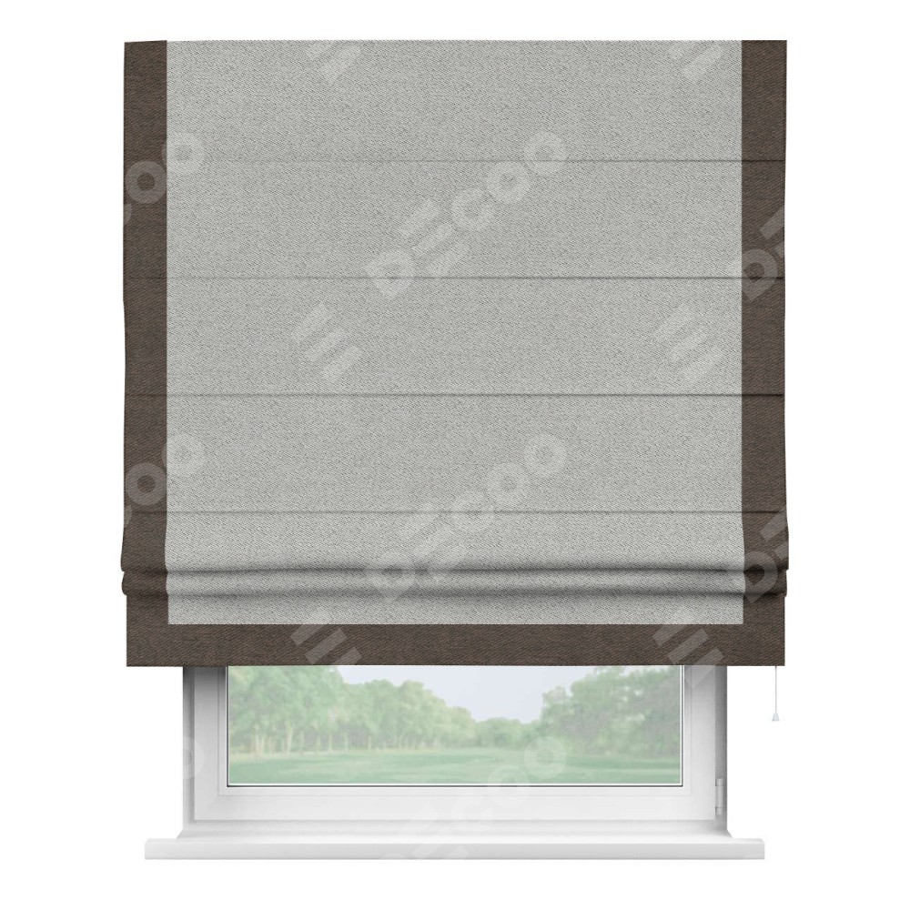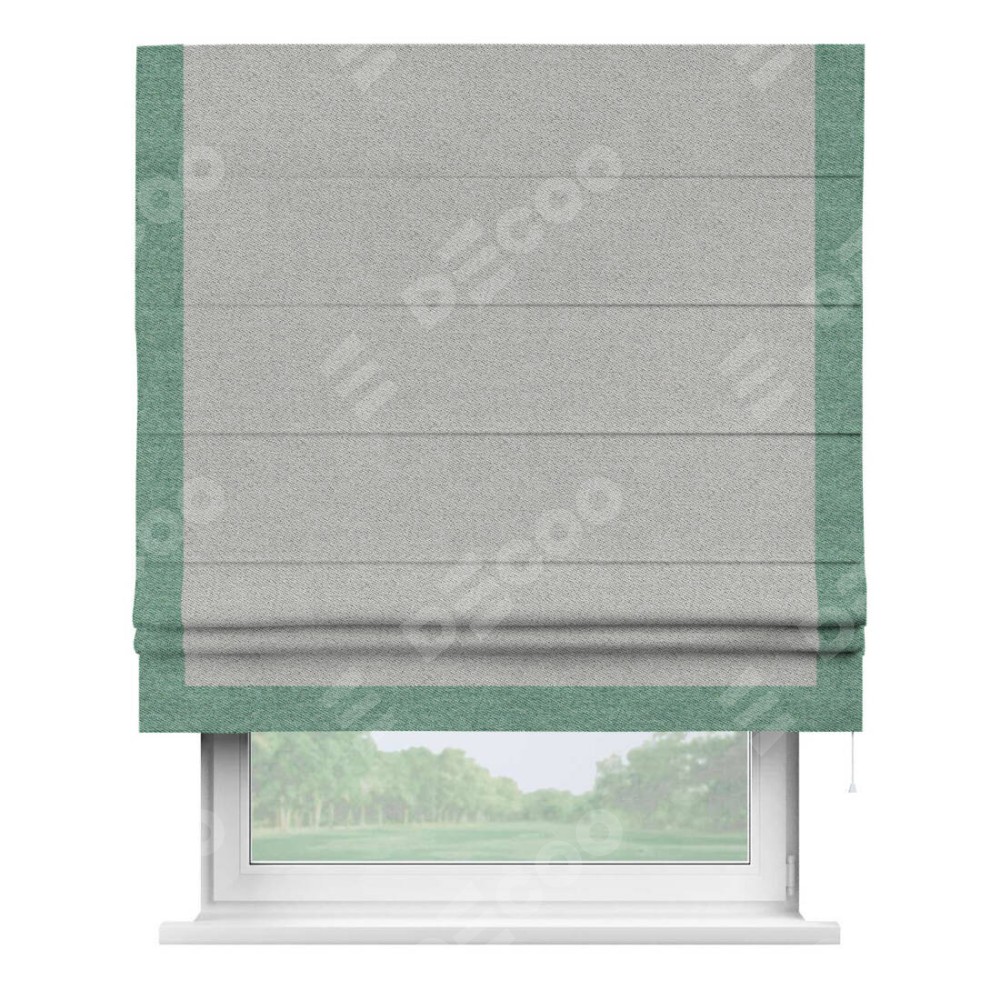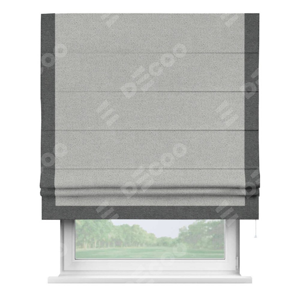 Римская штора производителя «Cortin», используется для проёма, пошита из ткани твид блэкаут светло-серый, артикул 90936. Отделка шторы кантом «Виктория», ткань для канта используется из твида разной расцветки на выбор. Имеет универсальный механизм и подходит для монтажа: на потолок, на стену и в нишу.
