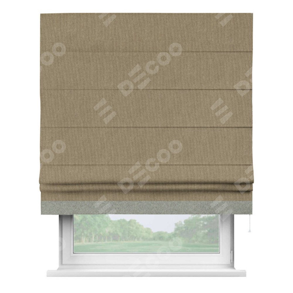 Римская штора пошита из ткани лён димаут тёмно-бежевый, артикул: 16261, с отделкой кантом «Джестер» выделяется своей уникальной особенностью — кантом, расположенным только снизу шторы. Этот дизайн добавляет оригинальности и игривости оконному оформлению, делая акцент на нижней части шторы и создавая интересный визуальный эффект. Отделка кантом на нижнем крае не только служит эстетической функции, но и способствует увеличению прочности и износостойкости ткани в этом месте.