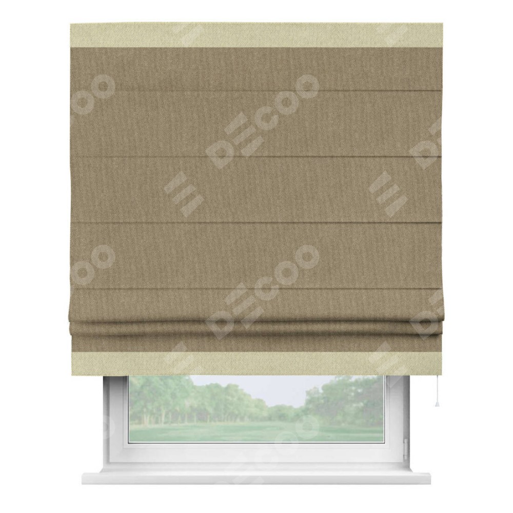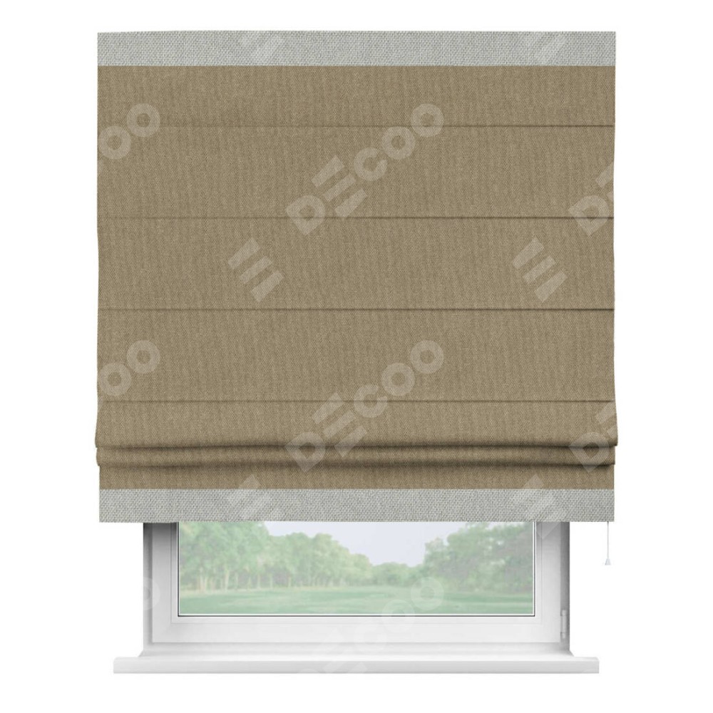 Римская штора пошита из ткани лён димаут тёмно-бежевый, артикул: 16261, с отделкой кантом «Горизонт» предлагает уникальное дизайнерское решение, при котором кант располагается только вверху и снизу шторы. Такое решение делает акцент на горизонтальных линиях, визуально расширяя пространство и придавая окну более строгий и организованный вид. Отделка кантом в этих ключевых местах не только украшает штору, но и способствует её долговечности, защищая наиболее уязвимые к износу края.