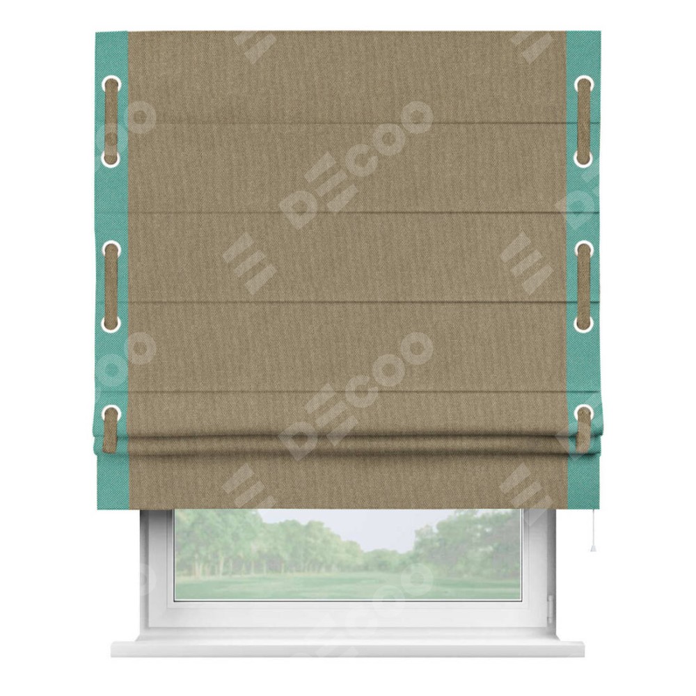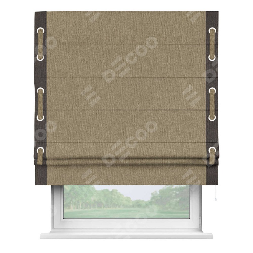 Римская штора «Кортин» для проема, лён димаут тёмно-бежевый с кантом Стрим Дуо (люверсы с пояском)