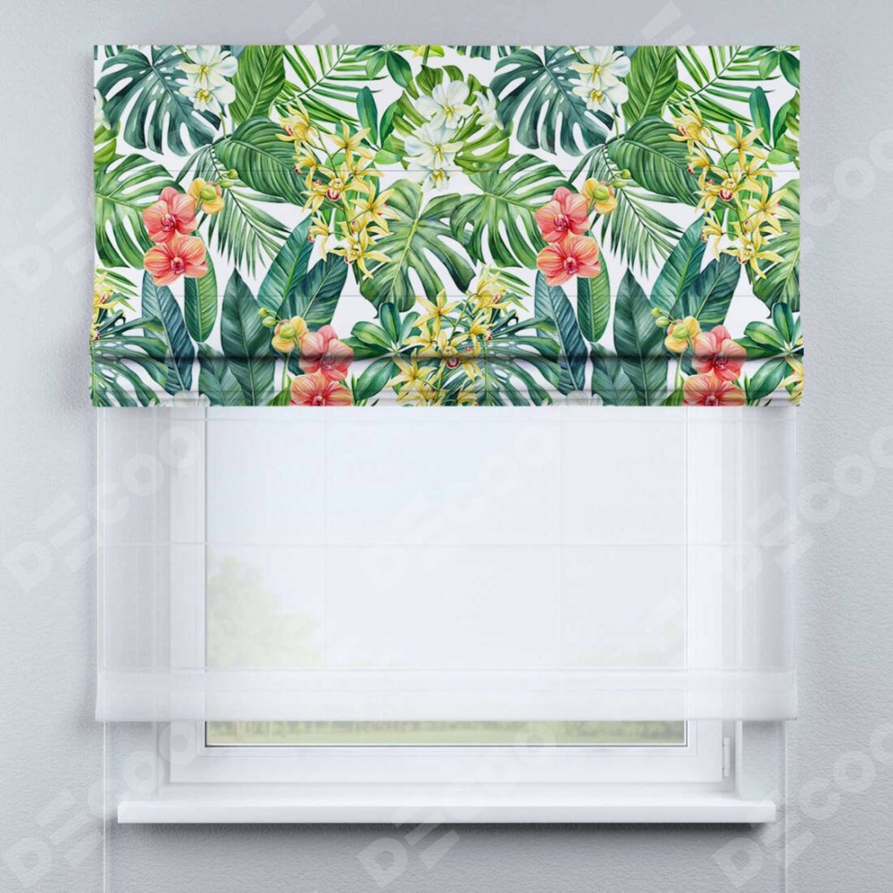 Двойная римская штора «День-ночь» от производителя Cortin предназначена для использования в проёмах. Эта штора уникальна тем, что состоит из двух полотен. На лицевой стороне находится блэкаут с нанесением сублимационной печати «Орхидеи в тропиках», обеспечивающий эффективное затемнение. В комплект также входит вторая ткань — легкий белый тюль (артикул: V-01), который добавляет изящества и легкости оформлению окна. Кроме того, доступны и другие разновидности ткани тюль, выбор которых доступен по ссылке .