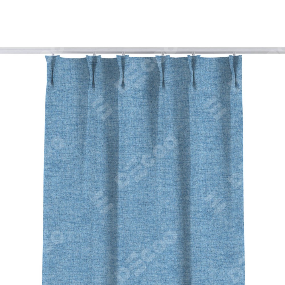 Комплект прямых штор, от производителя «Cortin», пошиты из ткани рогожка димаут голубой, артикул ткани 91025. С изнаночной стороны в верхней части штор пристрачивается шторная лента с декоративными складками «Кустик». Для создания элегантных складок прямые шторы шьются по стандарту с коэффициентом 1:2 (на 100 см. ширины проёма 200 см. ширины ткани).