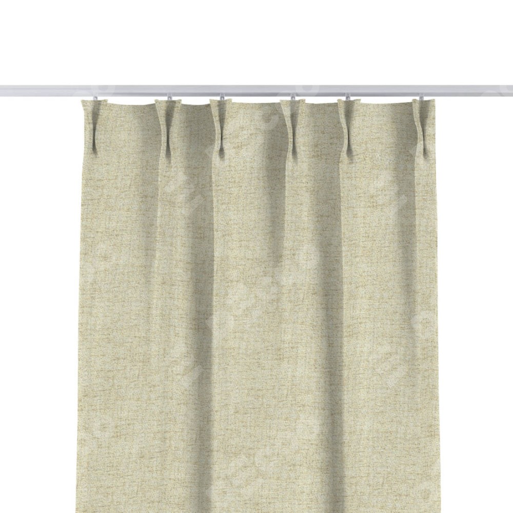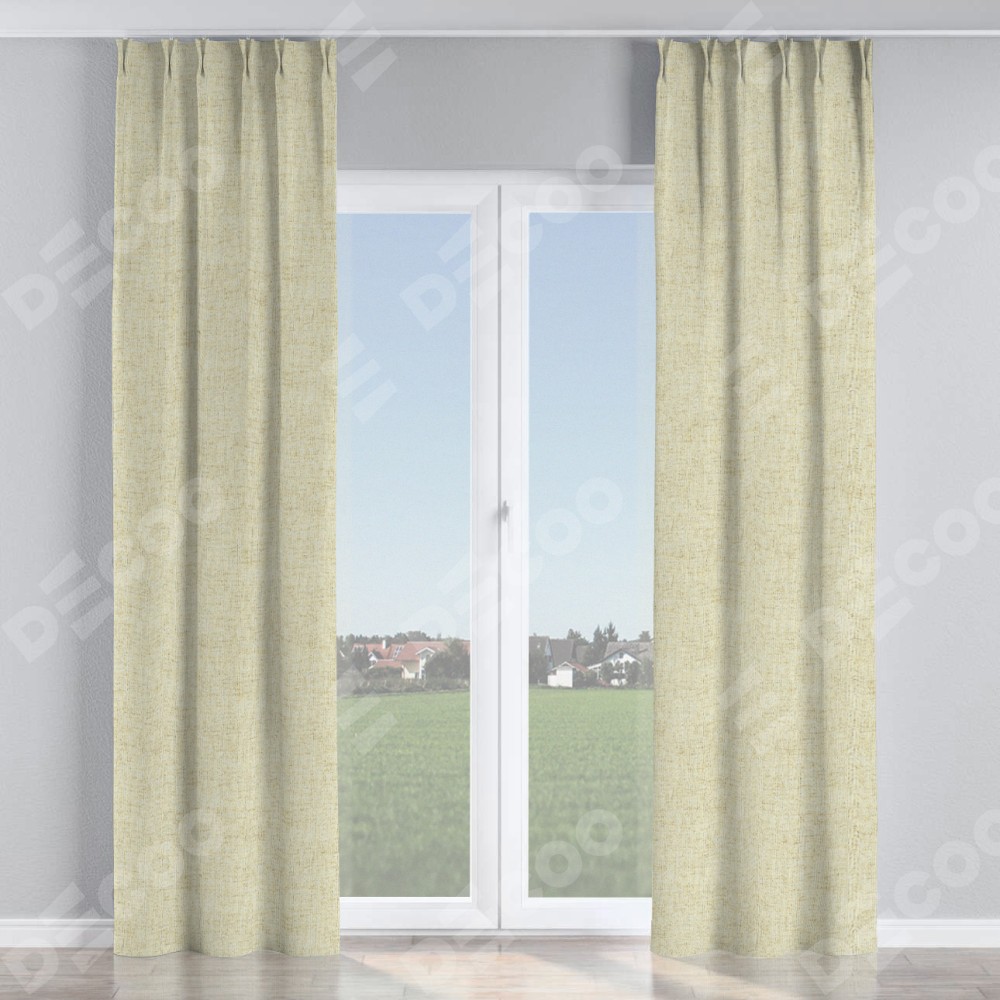 Комплект прямых штор, от производителя «Cortin», пошиты из ткани рогожка димаут золотой песок, артикул ткани 91015. С изнаночной стороны в верхней части штор пристрачивается шторная лента с декоративными складками «Кустик». Для создания элегантных складок прямые шторы шьются по стандарту с коэффициентом 1:2 (на 100 см. ширины проёма 200 см. ширины ткани).