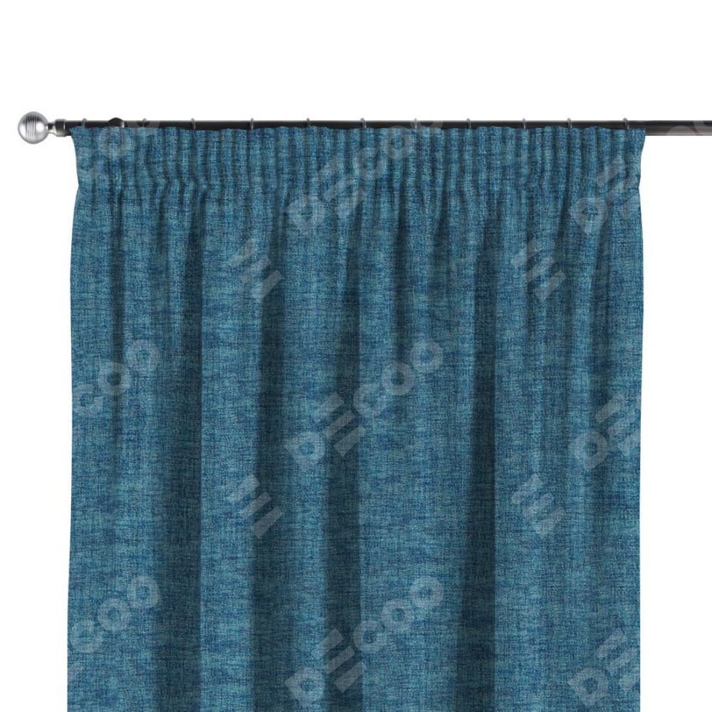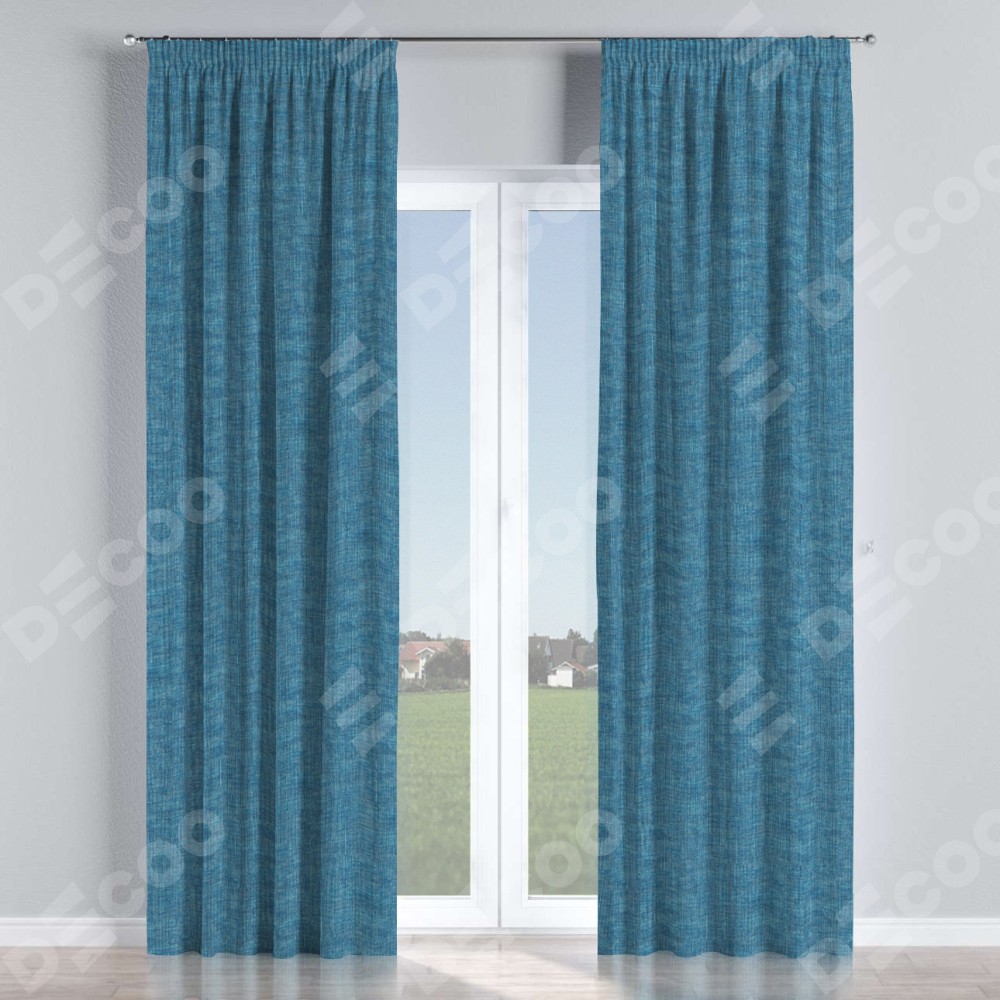 Комплект прямых штор, от производителя «Cortin», пошиты из ткани рогожка димаут лазурно-синий, артикул ткани 91024. С изнаночной стороны в верхней части штор пристрачивается шторная лента с декоративными складками «Карандаш». Для создания элегантных складок прямые шторы шьются по стандарту с коэффициентом 1:2 (на 100 см. ширины проёма 200 см. ширины ткани).