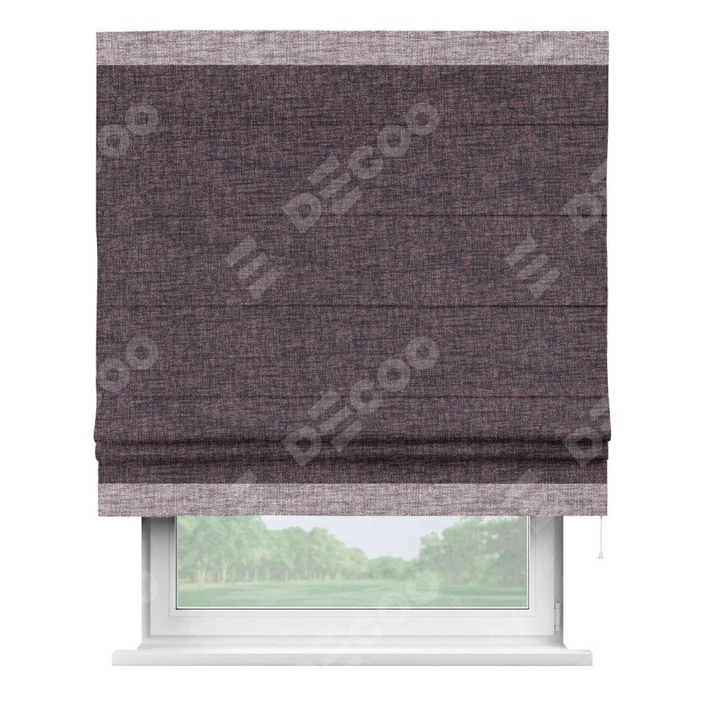 Римская штора пошита из ткани рогожка димаут розово-коричневый, артикул: 91020, с отделкой кантом «Горизонт» предлагает уникальное дизайнерское решение, при котором кант располагается только вверху и снизу шторы. Такое решение делает акцент на горизонтальных линиях, визуально расширяя пространство и придавая окну более строгий и организованный вид. Отделка кантом в этих ключевых местах не только украшает штору, но и способствует её долговечности, защищая наиболее уязвимые к износу края.