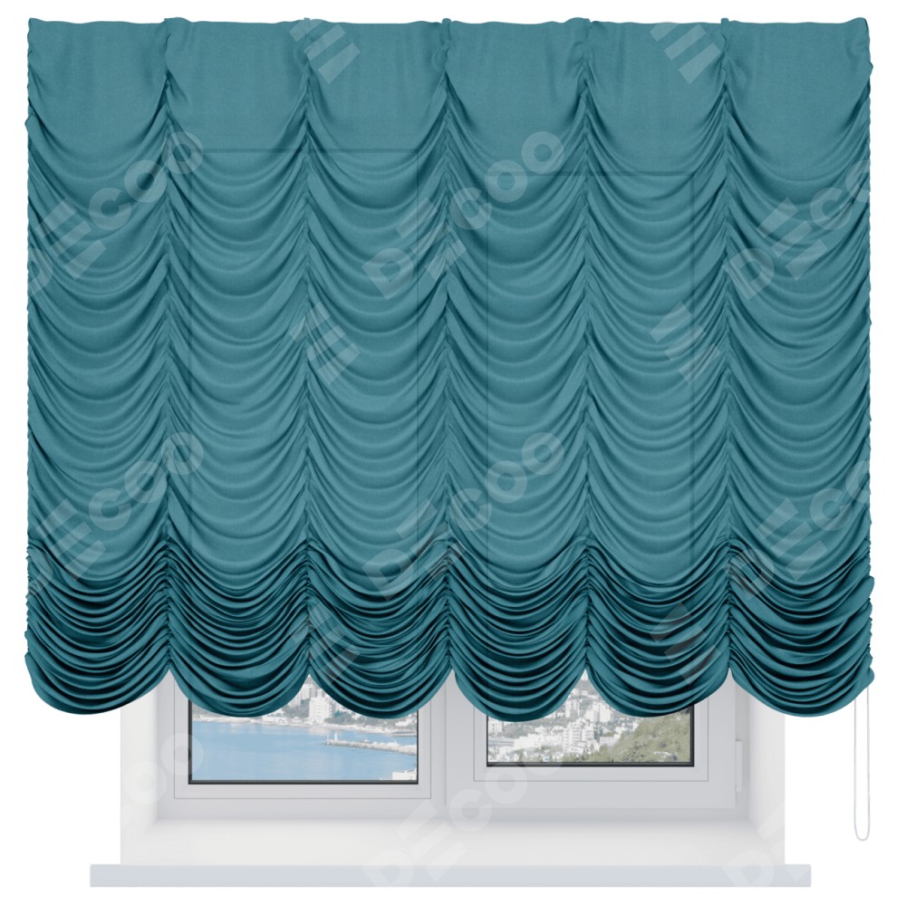 Французская штора производителя «Cortin», используется для проёма, пошита из ткани лён бирюзовый, артикул ткани 53436. Имеет универсальный механизм и подходит для монтажа: на потолок и на стену.