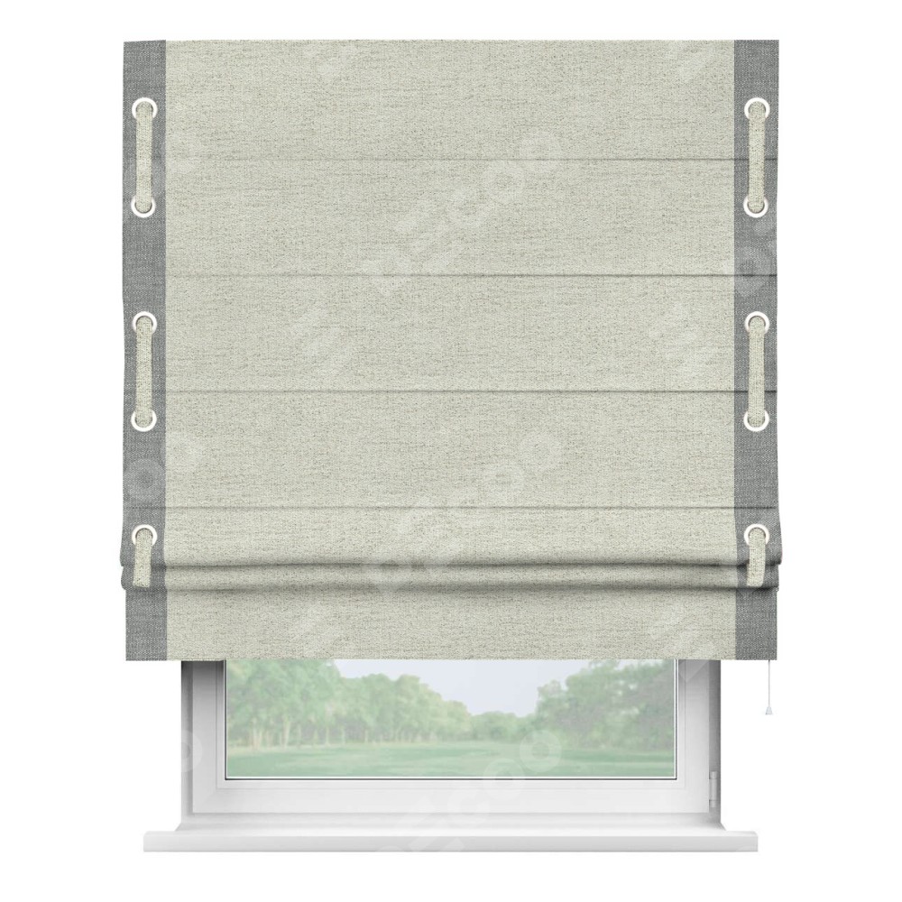 Римская штора пошита из ткани рогожка димаут серо-бежевый, артикул: 91014, с отделкой кантом «Стрим Дуо», дополненная декоративными люверсами на этих кантах и протянутым пояском из основного цвета римской шторы, представляет собой высоко декоративное и функциональное решение для оконного оформления. Канты, расположенные по обеим боковым сторонам шторы, уже добавляют изысканности и завершенности внешнему виду. Добавление люверсов и пояска не только усиливает декоративный эффект, но и придает шторе дополнительную текстурность и глубину.