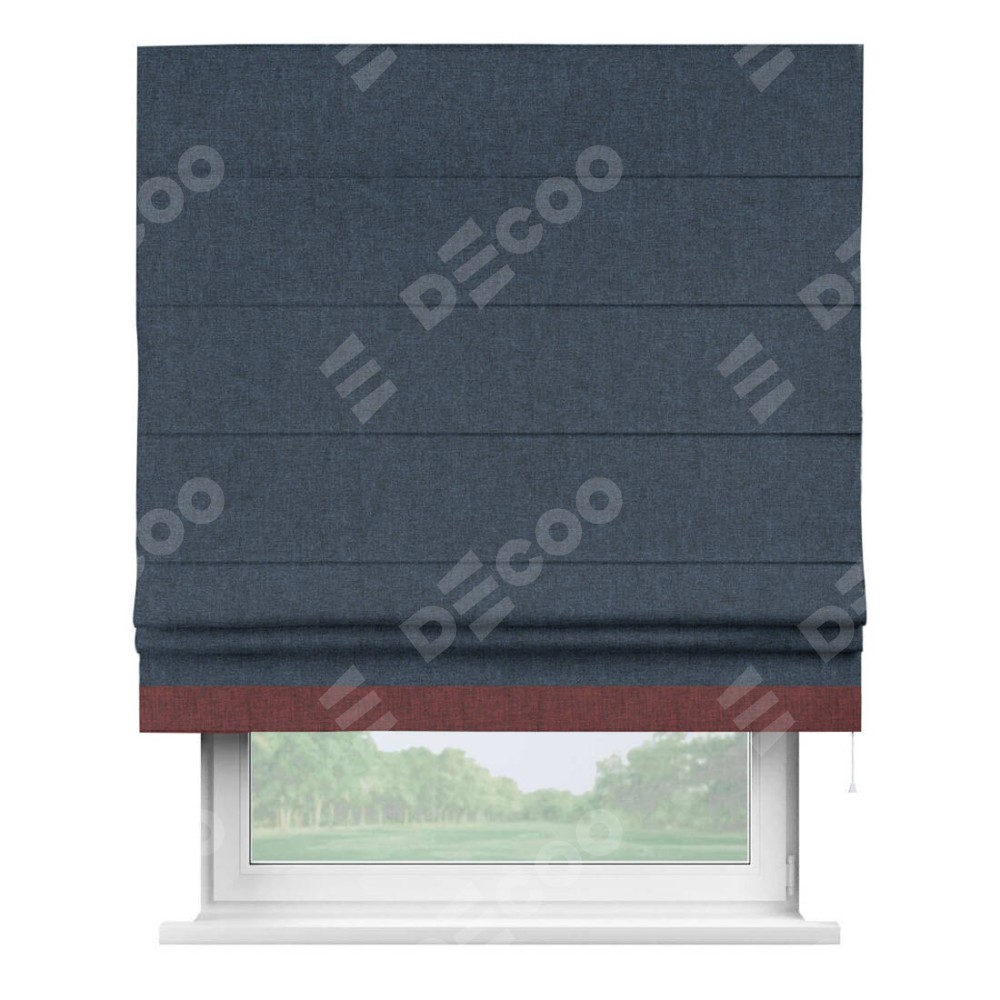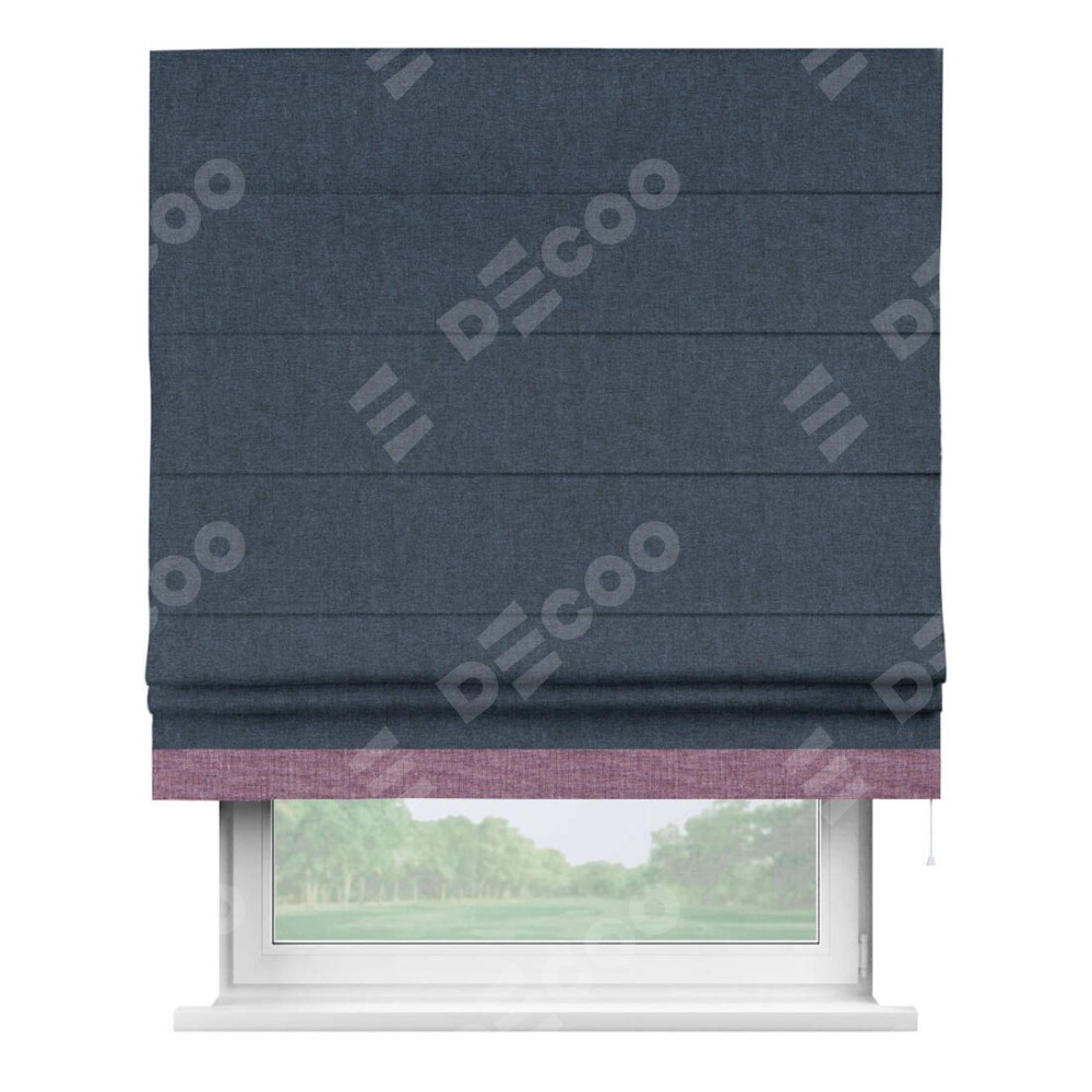 Римская штора пошита из ткани лён кашемир синий, артикул: 21623, с отделкой кантом «Джестер» выделяется своей уникальной особенностью — кантом, расположенным только снизу шторы. Этот дизайн добавляет оригинальности и игривости оконному оформлению, делая акцент на нижней части шторы и создавая интересный визуальный эффект. Отделка кантом на нижнем крае не только служит эстетической функции, но и способствует увеличению прочности и износостойкости ткани в этом месте.