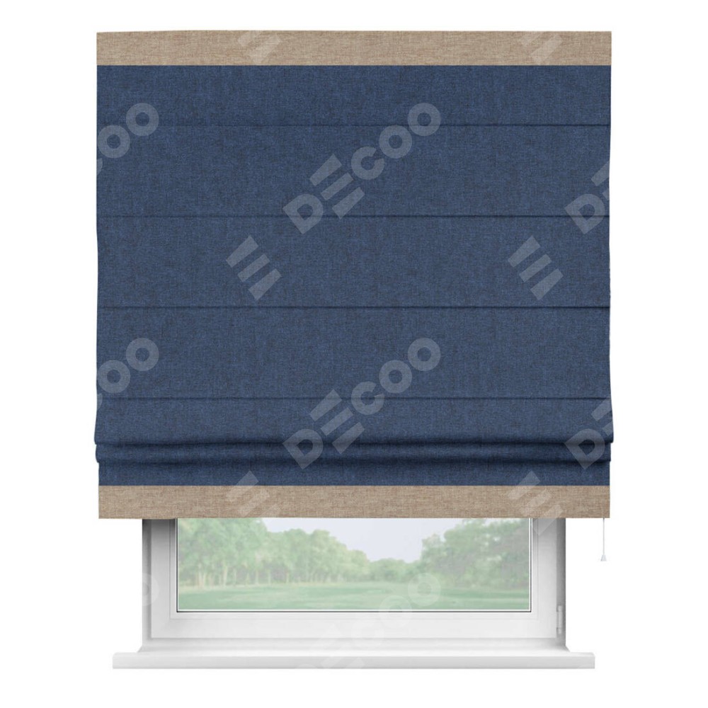 Римская штора пошита из ткани лён кашемир тёмно-синий, артикул: 17215, с отделкой кантом «Горизонт» предлагает уникальное дизайнерское решение, при котором кант располагается только вверху и снизу шторы. Такое решение делает акцент на горизонтальных линиях, визуально расширяя пространство и придавая окну более строгий и организованный вид. Отделка кантом в этих ключевых местах не только украшает штору, но и способствует её долговечности, защищая наиболее уязвимые к износу края.