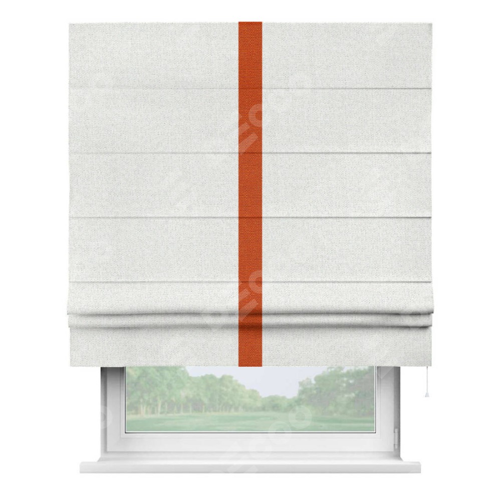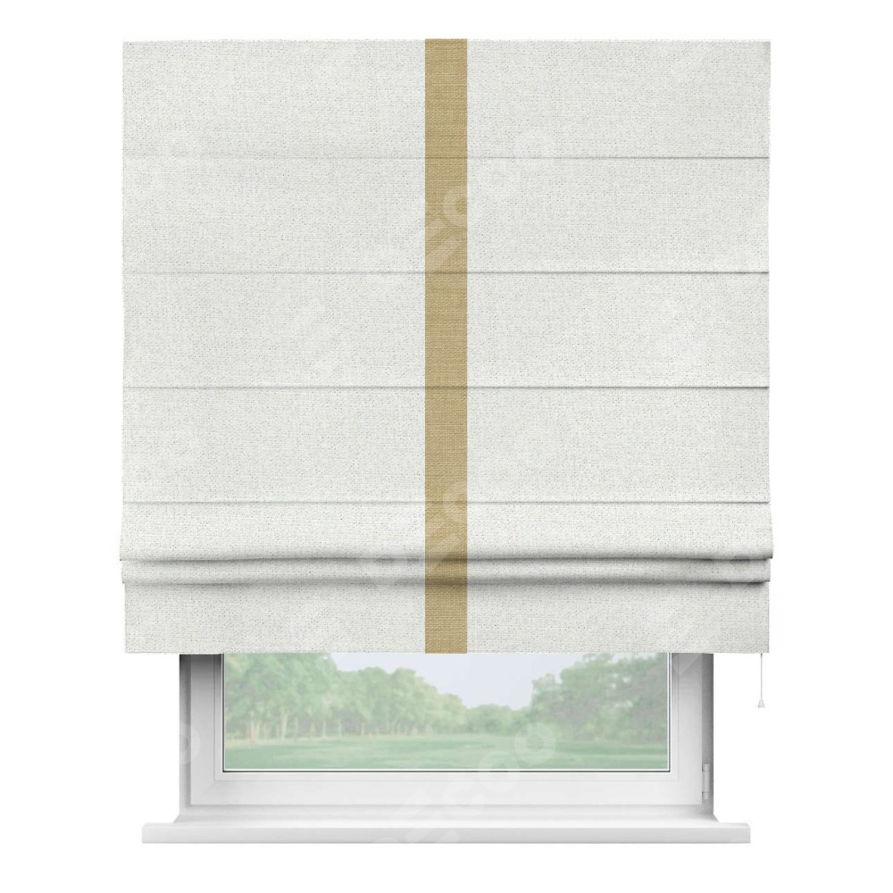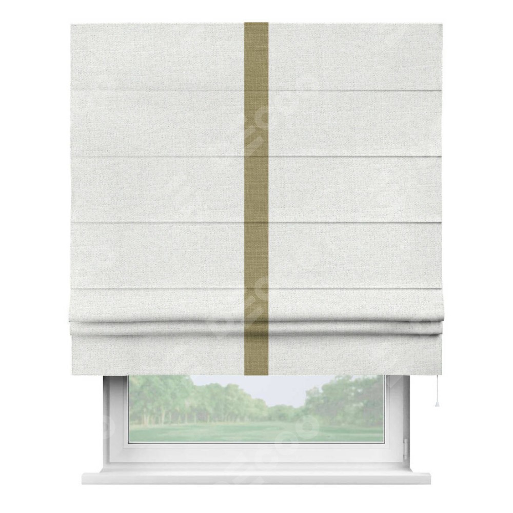 Римская штора пошита из ткани лён шампань, артикул: 91399, с отделкой кантом «Хайвэй» представляет собой уникальное и смелое дизайнерское решение, где кант расположен вертикально посередине шторы. Этот дизайн не только выделяет штору среди других вариантов оформления окон, но и создает интересный визуальный акцент, привлекая внимание к центру окна и разделяя штору на визуальные зоны. Такой нестандартный подход добавляет динамичности интерьеру и может быть использован для подчеркивания особенностей оформления помещения.