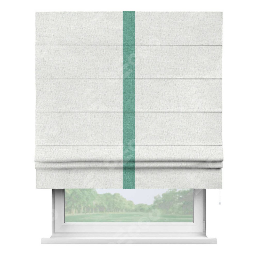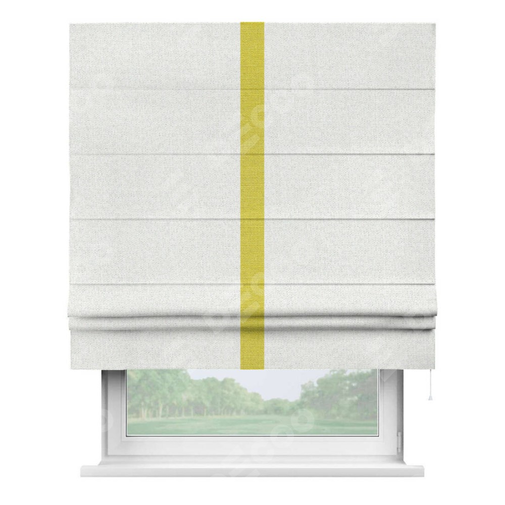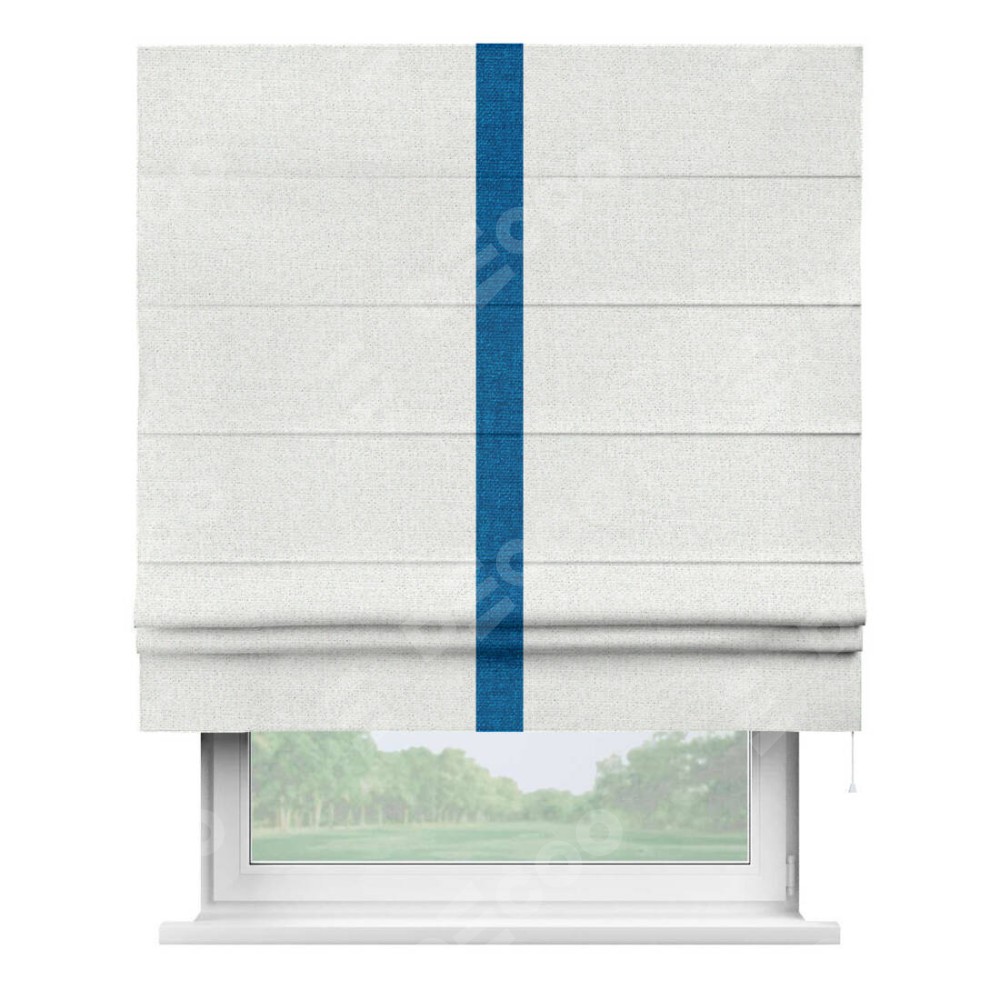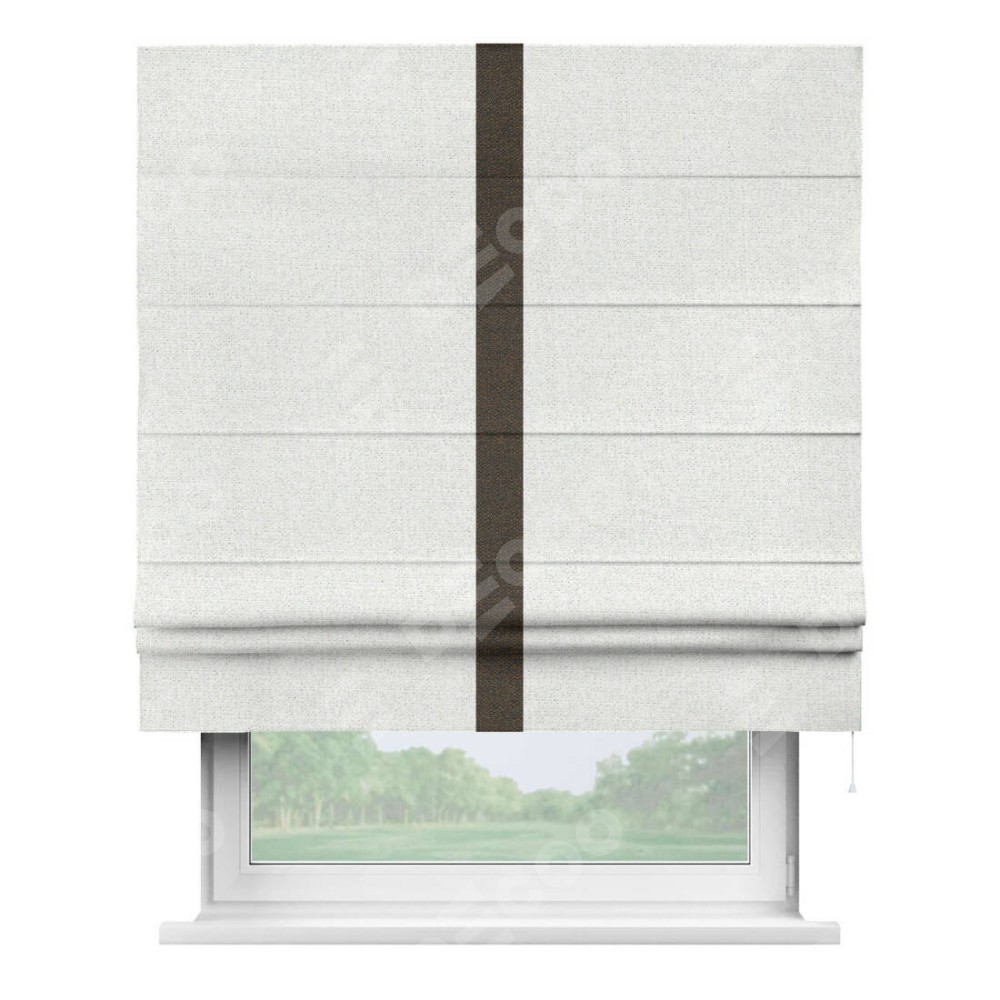 Римская штора пошита из ткани лён шампань, артикул: 91399, с отделкой кантом «Хайвэй» представляет собой уникальное и смелое дизайнерское решение, где кант расположен вертикально посередине шторы. Этот дизайн не только выделяет штору среди других вариантов оформления окон, но и создает интересный визуальный акцент, привлекая внимание к центру окна и разделяя штору на визуальные зоны. Такой нестандартный подход добавляет динамичности интерьеру и может быть использован для подчеркивания особенностей оформления помещения.